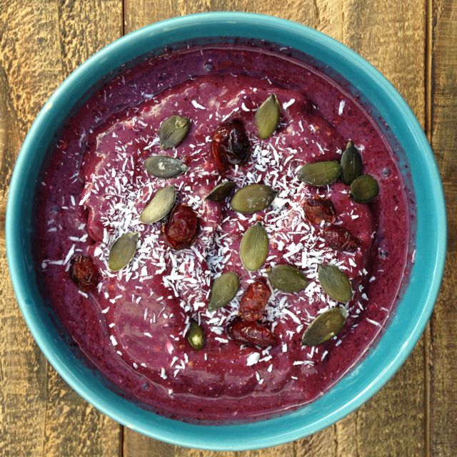 - Add all smoothie ingredients into your blend and blend until smooth. Top with any of your favorite toppings. (Our bowl was topped with pumpkin seeds, coconut and dried cranberries)
