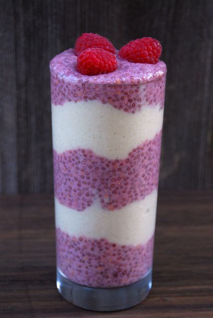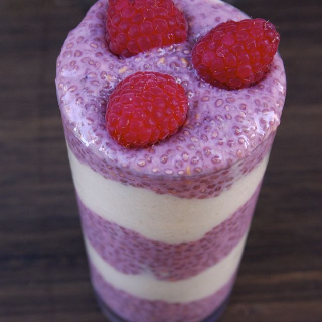 - Layer chia pudding and smoothie in a tall parfait glass. Top with fresh fruit or nuts and serve.
