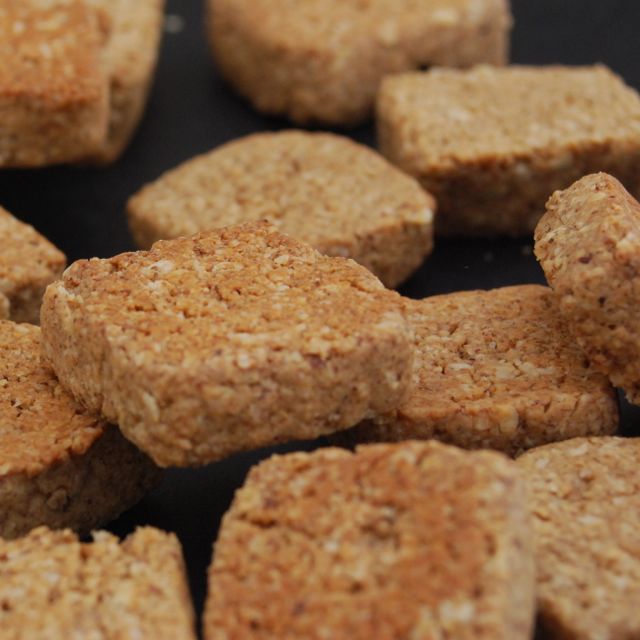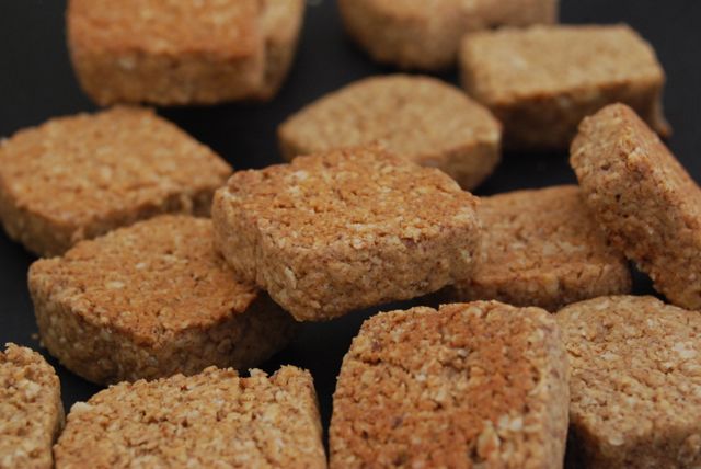 - Form mixture into a log and place on parchment paper. Flatten on all four sides with a spatula and slice with a sharp knife into 1/4" thick cookies. This step is optional.