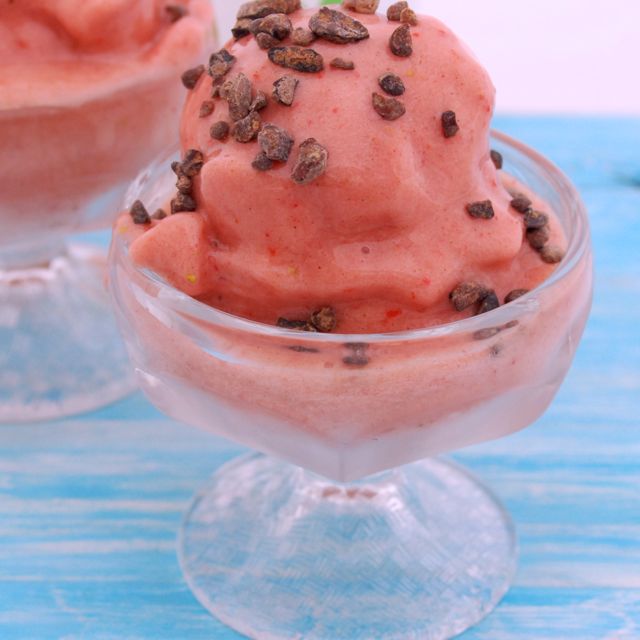 What goes into a “simple” dessert? For me, a simple and healthy dessert starts with limited ingredients that can be thrown together quickly. My Simple Strawberry Sorbet uses only four ingredients but can easily be made with three. My fourth powerhouse ingredient is the addition of camu camu powder from Navitas Naturals, making this simple dessert, not only low in calories, but high in vitamin C. Great for your skin and your belly.