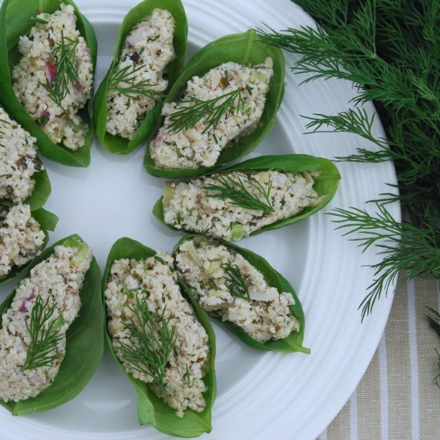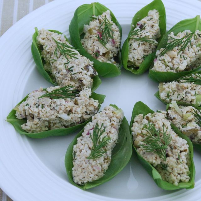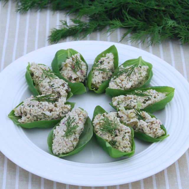 - Scoop by the spoonful into basil leaves. Garnish with fresh basil. Refrigerate until ready to serve.