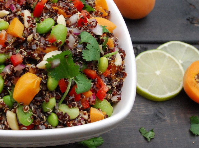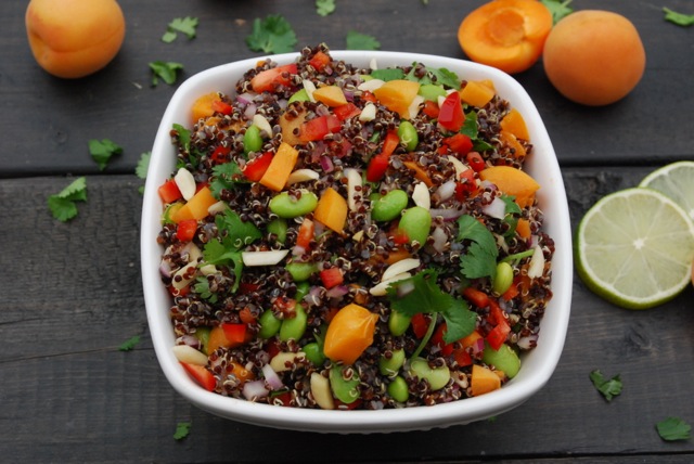 - Using a large bowl, combine cooled quinoa, chopped onion, apricots, bell pepper, shelled edamame, slivered almonds and cilantro leaves. Lightly toss.