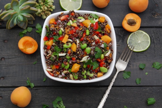 Now that school is out and summertime is officially in full swing, most families are in need of nutritious recipes that can be thrown together in minutes. My summer meal survival tips include, planning ahead, getting the kids involved, and keeping it simple. I typically prepare quinoa two times per week as a base for many of my warm weather recipes. This amazing pseudo-grain cooks in 18-20 minutes, stores well in the refrigerator and is the perfect addition to any summer salad or vegan casserole. I’m keeping it simple tonight with my idea of a Stone Fruit Quinoa Salad. I’ve used apricots in our quinoa salad because they were organic and on sale, but feel free to substitute any of your favorite stone fruit; apricots, plums, nectarines, cherries, or peaches.