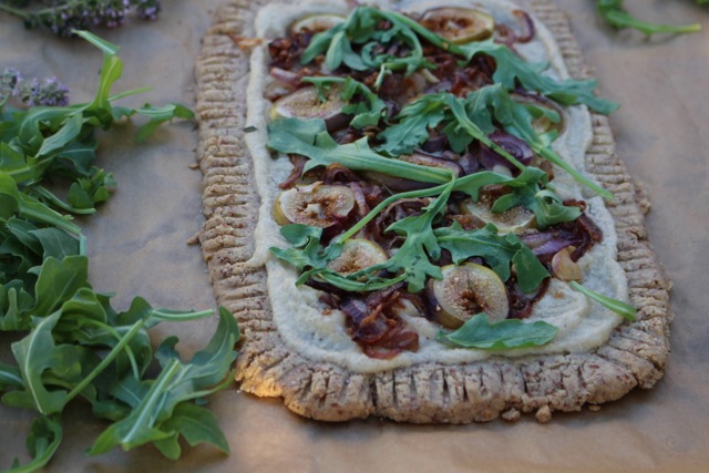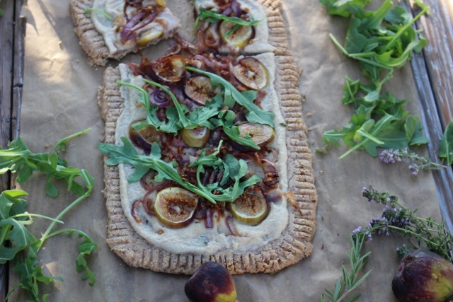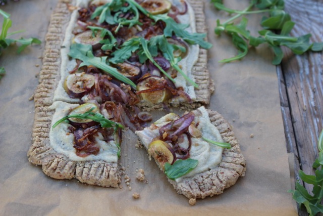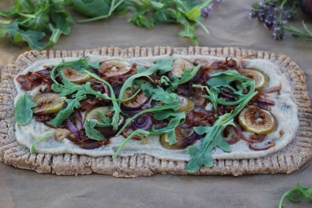For those of you new to a vegan diet, feeling deprived when it comes to the “p” word…PIZZA, is not unusual! I won’t deny the smell of a cheesy pie turns my head on occasion, but learning to replace animal products with something of similar consistency is a great tip for success. Cashew cheese is one of the most versatile and easy cheese spreads to make. It can be as plain or jazzed up as you like. We’ve kept it fairly simple for this recipe, but I did throw in some fresh rosemary to go with our figs.