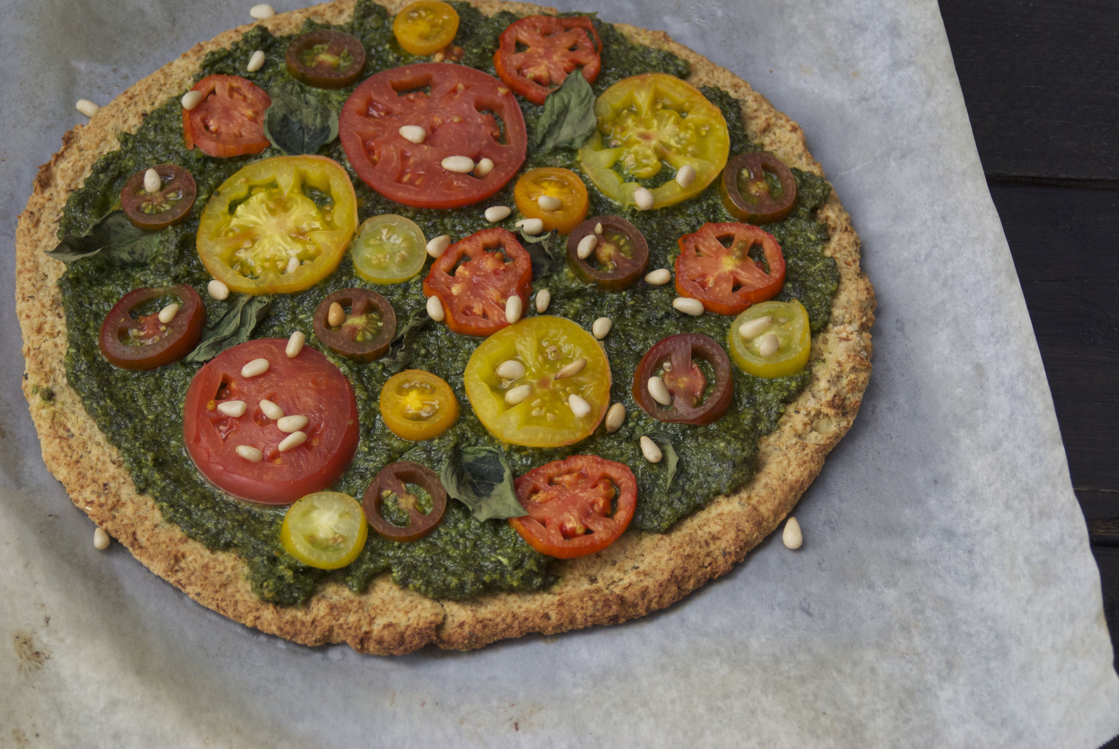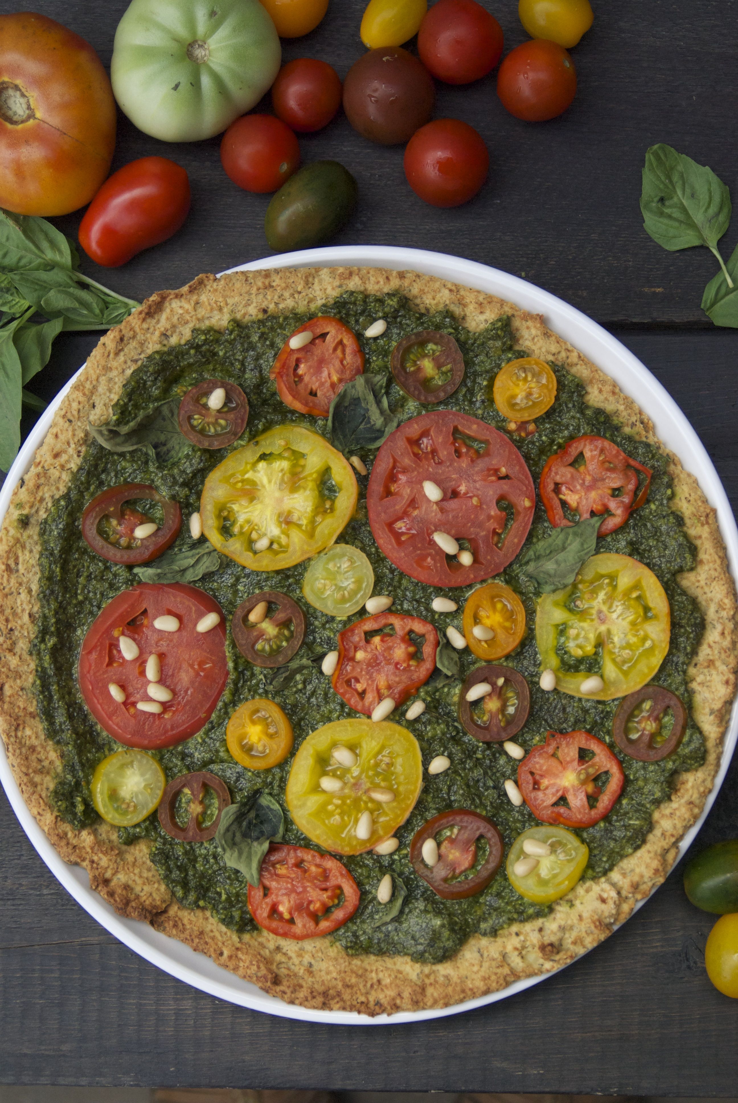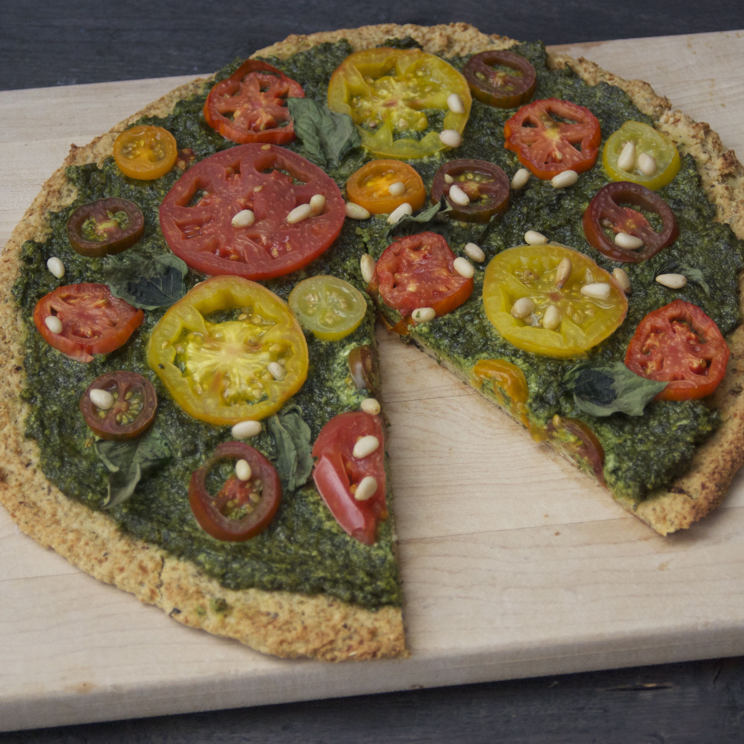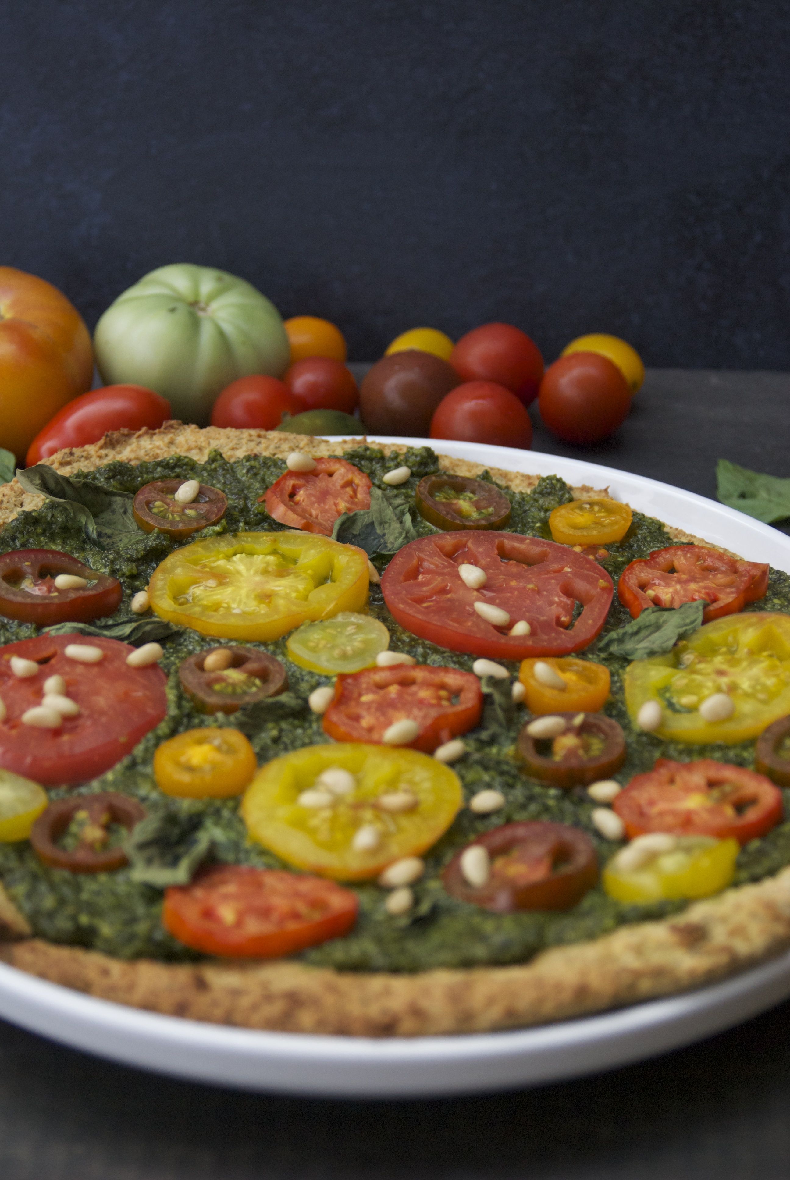 - Top prepared crust with homemade pesto and sliced heirloom tomatoes, fresh basil and pine nuts. Feel free to add any other veggies of choice.