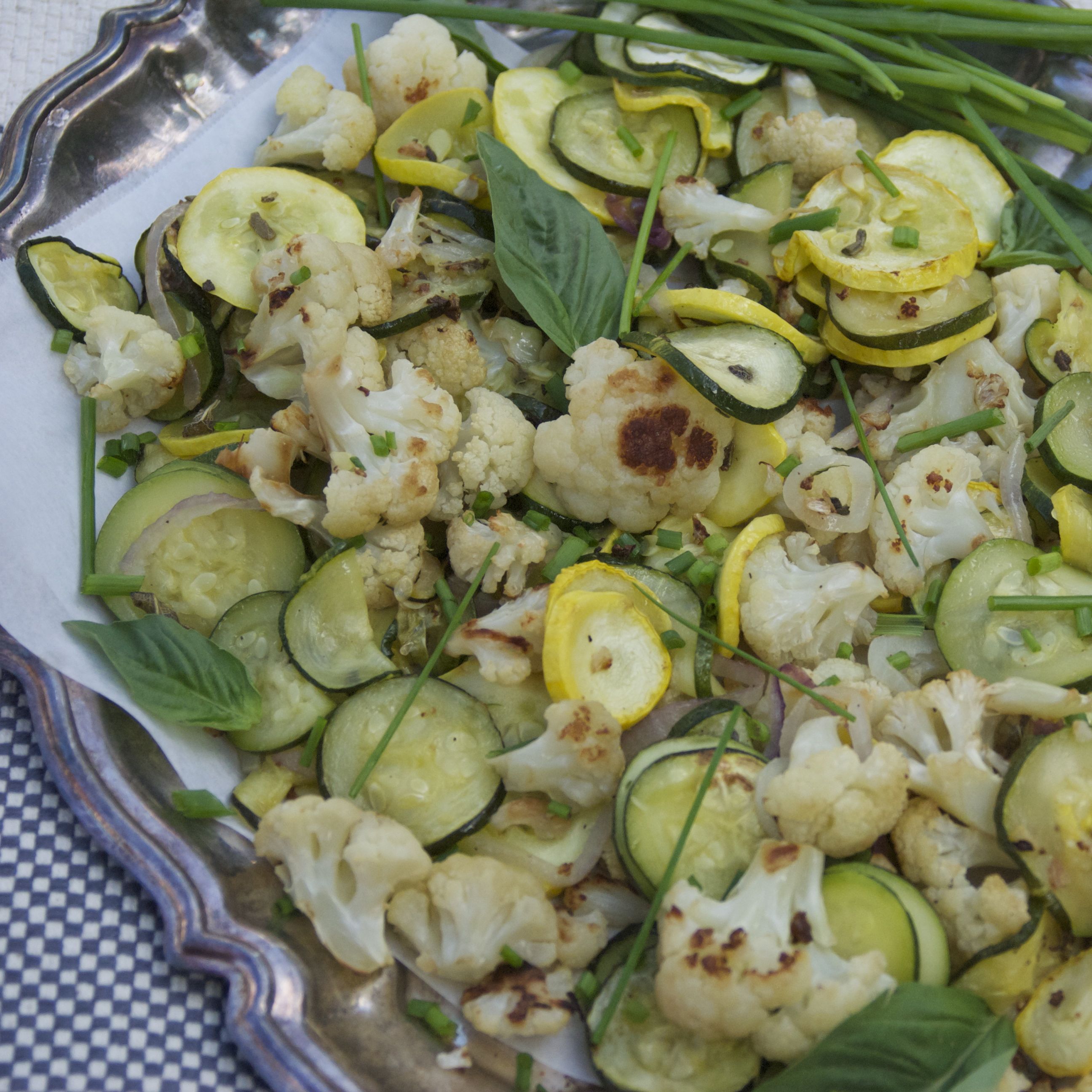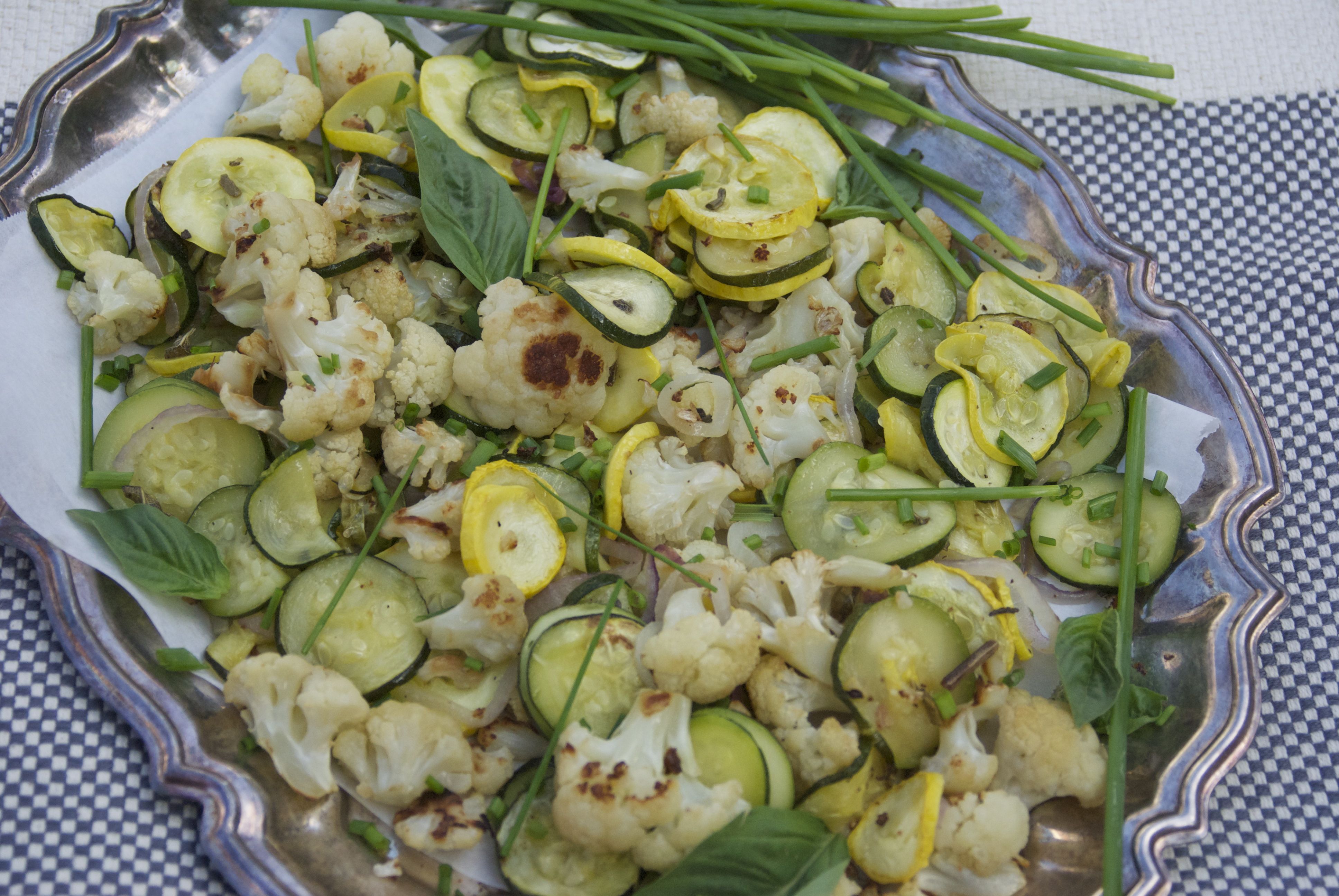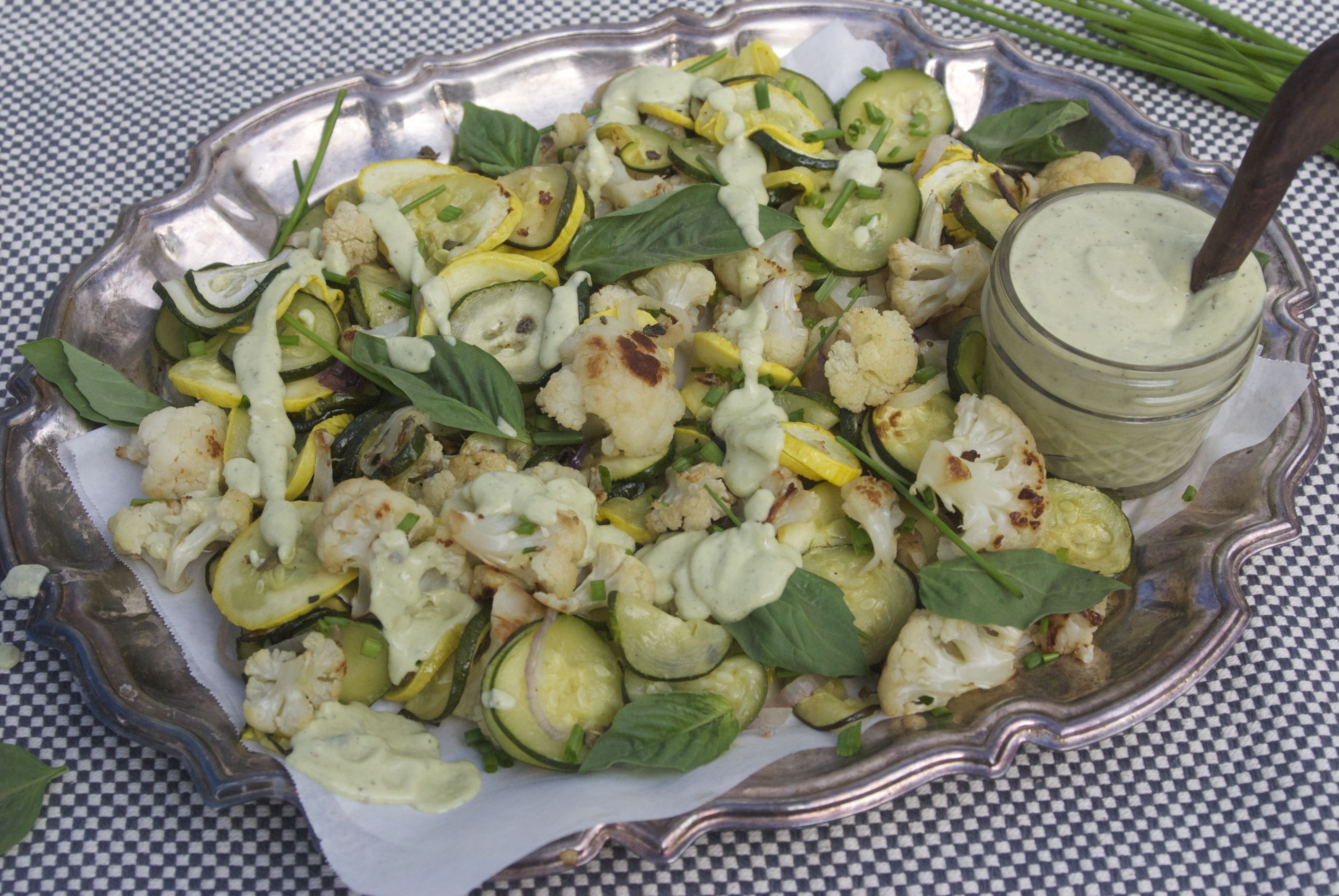 I’m often asked how I get my family to eat their veggies. The short answer is simple, offer a variety of color, texture and flavors. Serve with an easy-to-make, nutrient-rich homemade veggie-based dip or dressing to pump up the flavor. (Yes, dressings and dips can be made with MORE veggies). No need for excess oil or sugar, simply use the veggies you have on hand and blend them up in your Vitamix or other high speed blender. Our Herb Roasted Summer Veggies are packed with flavor and combine cauliflower florets, ripe summer squash, and Herbs de Provence (French thyme, savory, fennel, rosemary, marjoram, basil, lavender and tarragon). Feel free to use any of your favorite herbal combinations or simply sprinkle with a little sea salt and fresh cracked pepper.