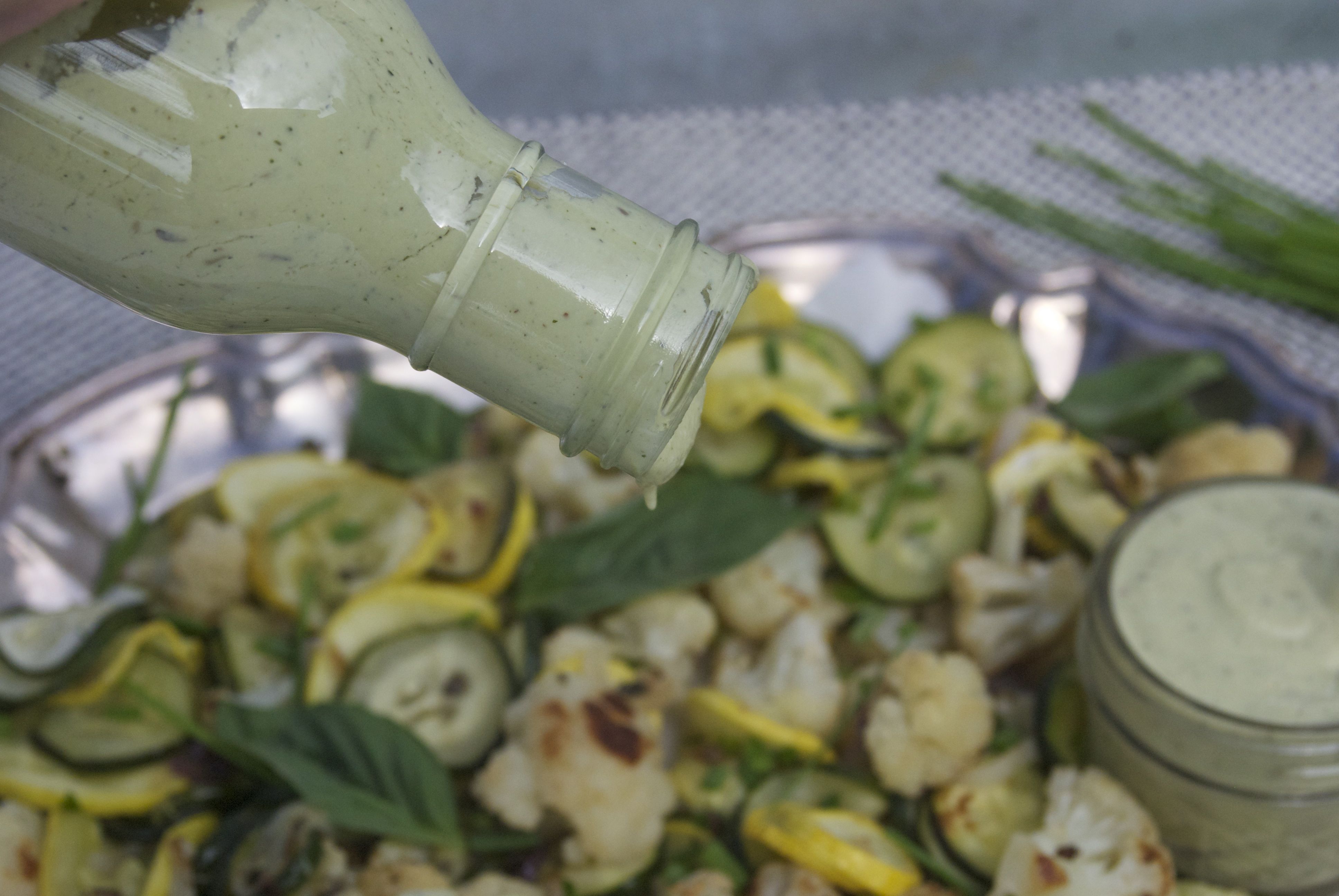 Homemade Creamy Avocado Green Goddess Dressing: delicious when poured over our Herb Roasted Summer Veggies