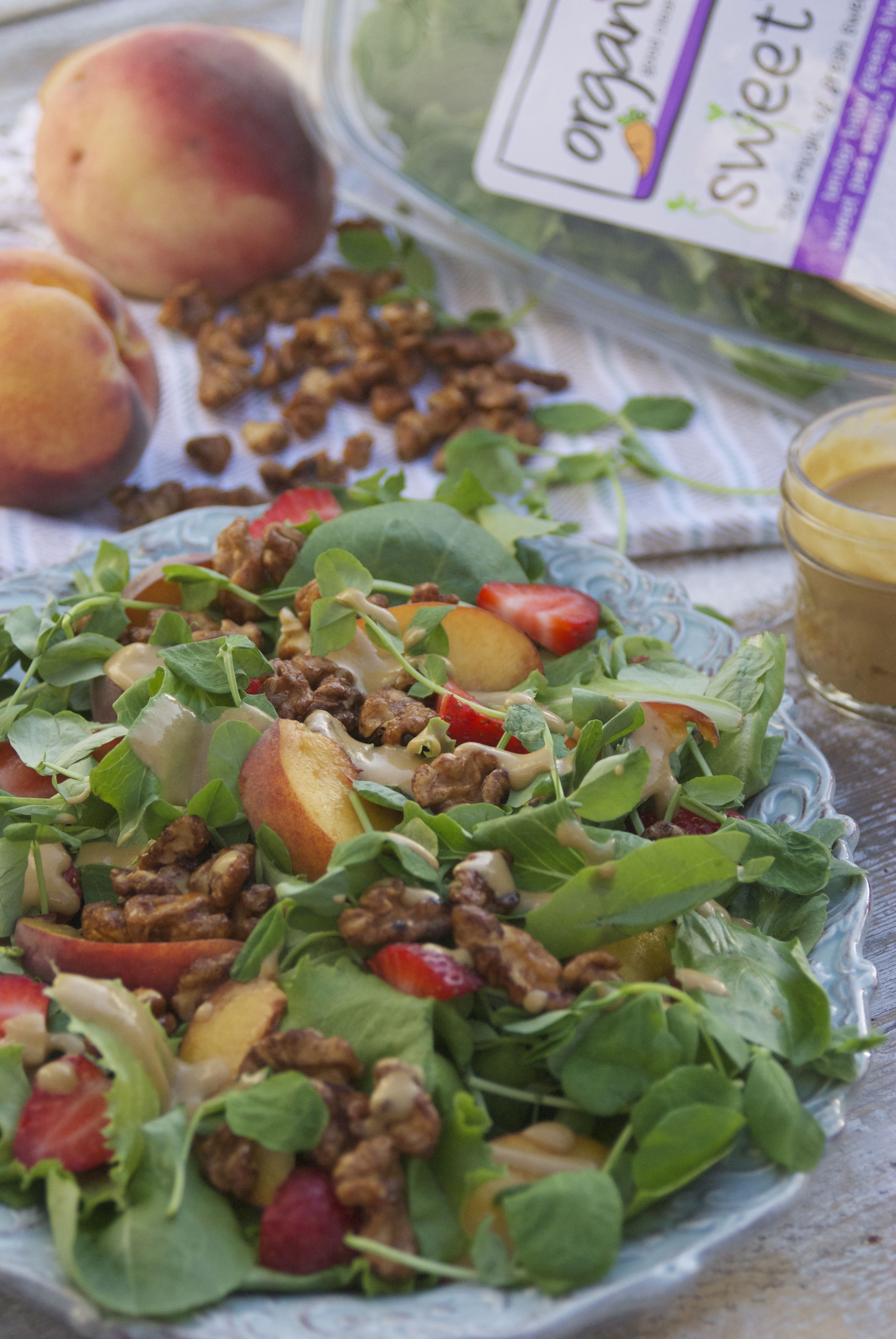 We’re saying goodbye to summer this weekend with our Sweet Pea Shoots and Peaches Salad. A beautiful salad with a grassy sweetness, fitting for any Labor Day gathering. Starting with Organic Girl Sweet Pea Shoots, this salad packs quite a nutritional punch. Did you know Sweet Pea Shoots have seven time more vitamin C than oranges, more vitamin A than tomatoes, and are rich in folic acid?