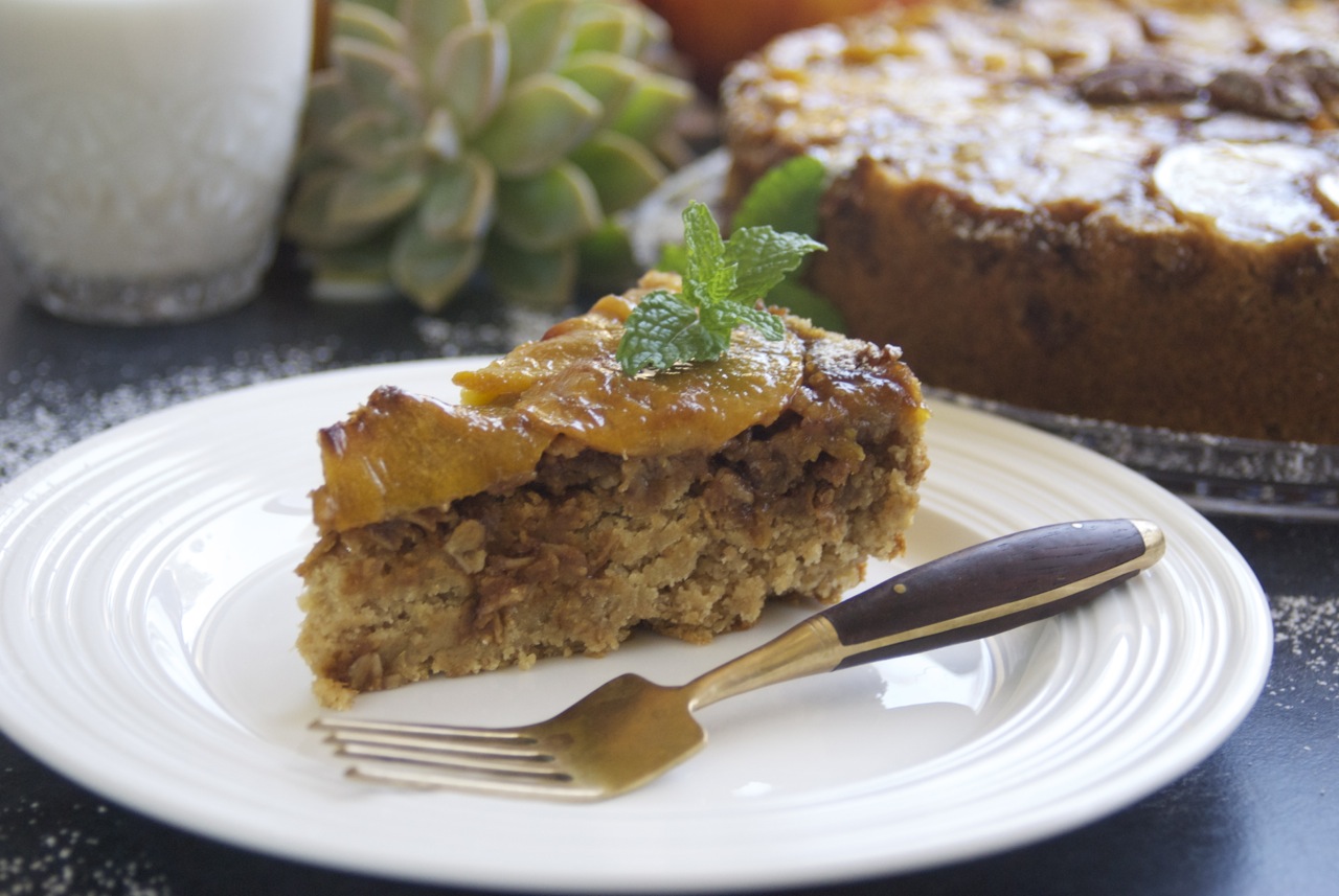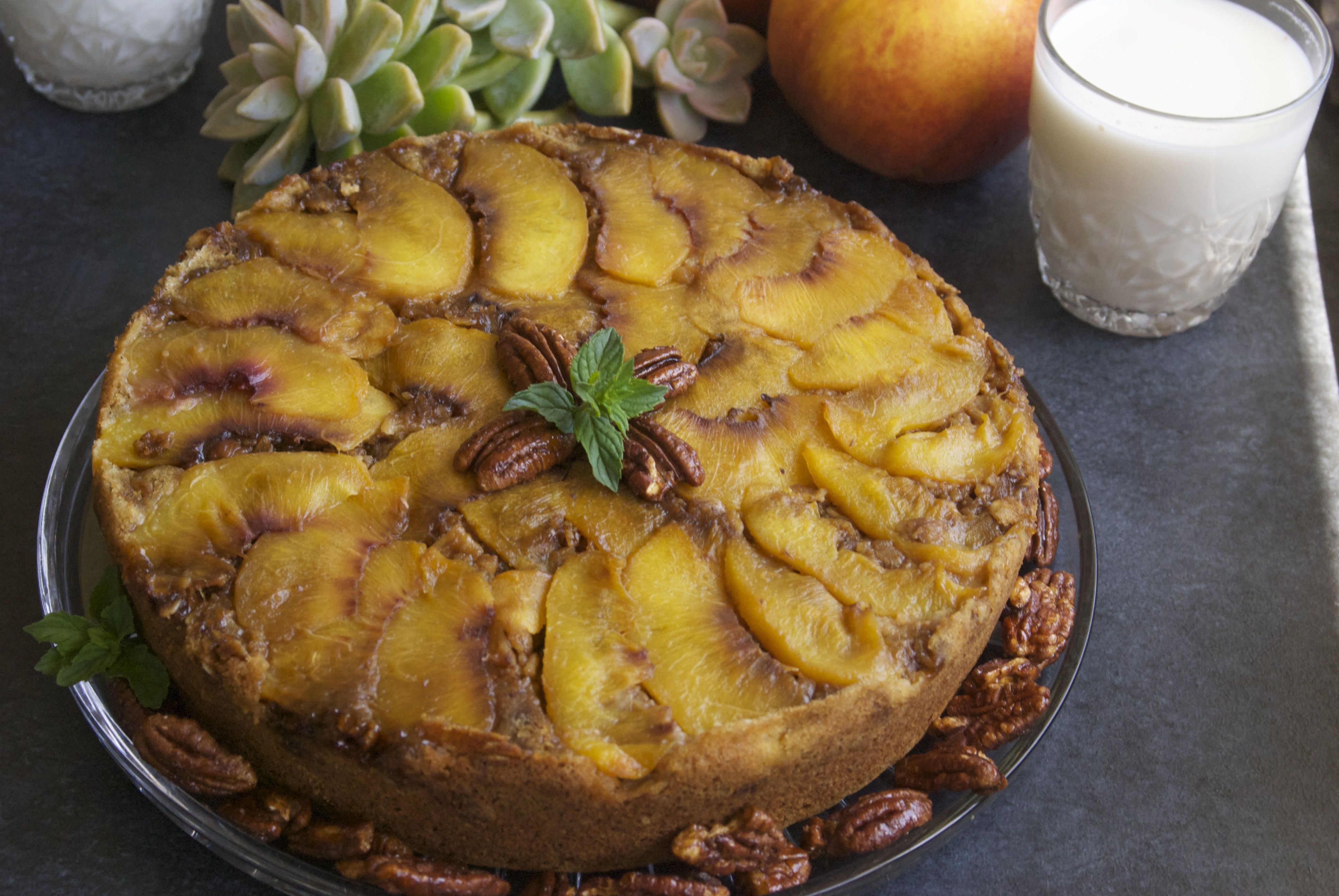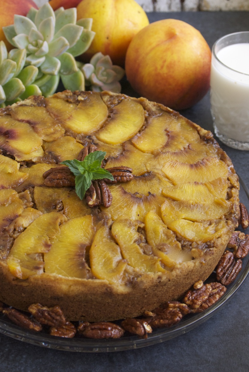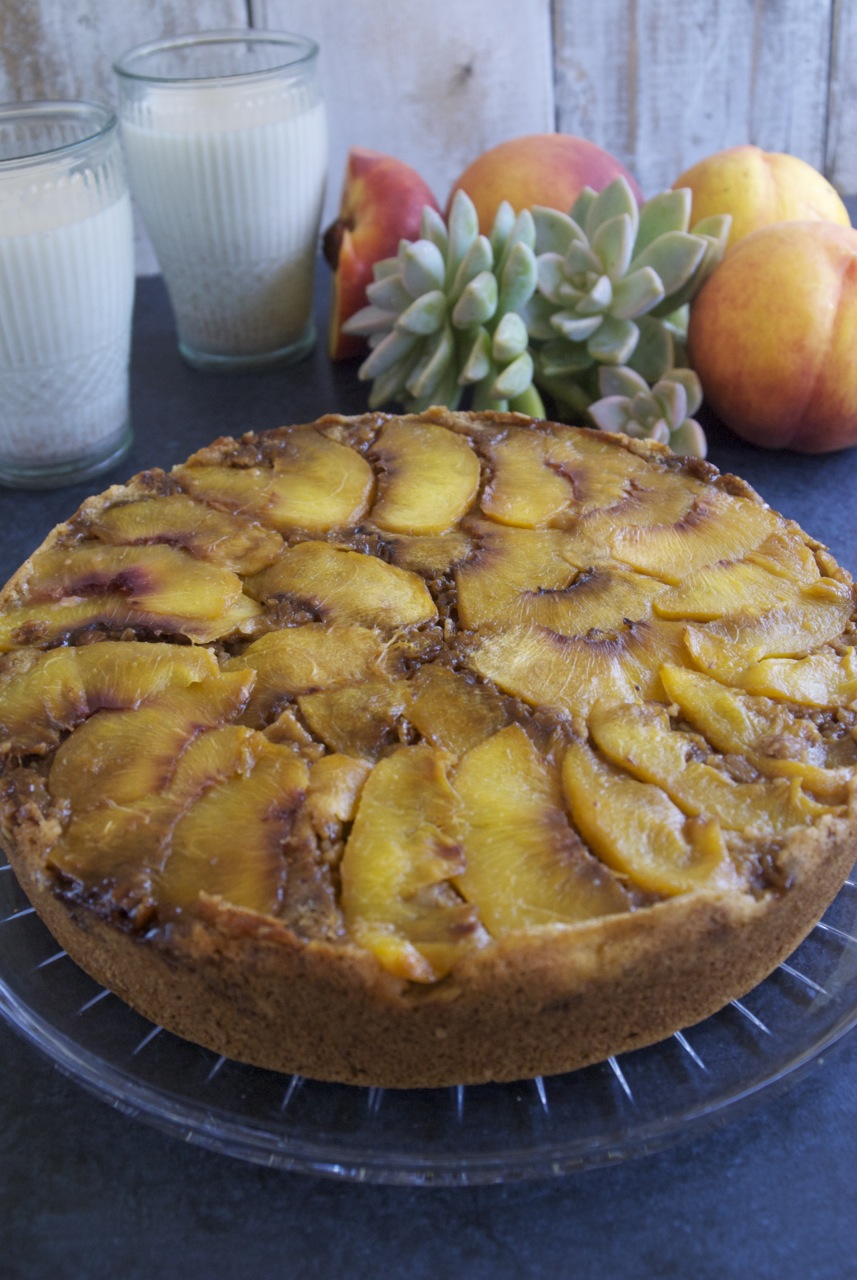 When I was a kid, I absolutely loved pineapple upside down cake. There was just something so special about flipping a cake out of it’s pan to unveil the gooey, caramelized brown sugar topping and strategically placed yellow rings of pineapple, each with it’s own bright-red cherry center. Using my love of the upside down cake as inspiration, I’ve created a twist on this old favorite by using peaches instead of pineapple. Our Gluten Free Vegan Peach Upside Down Cake was created as a fitting farewell to peach season. Goodbye my sweet, fuzzy friends!