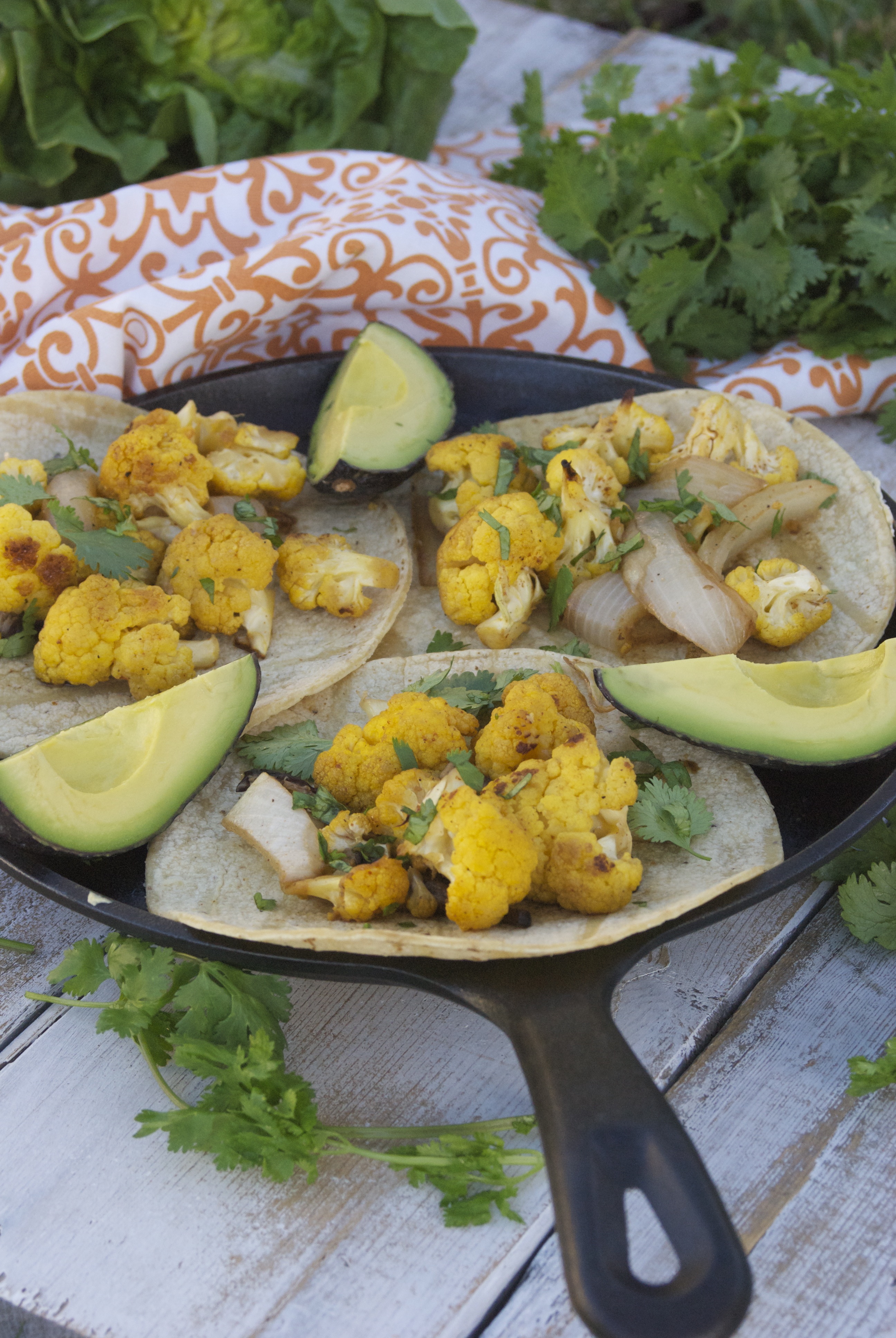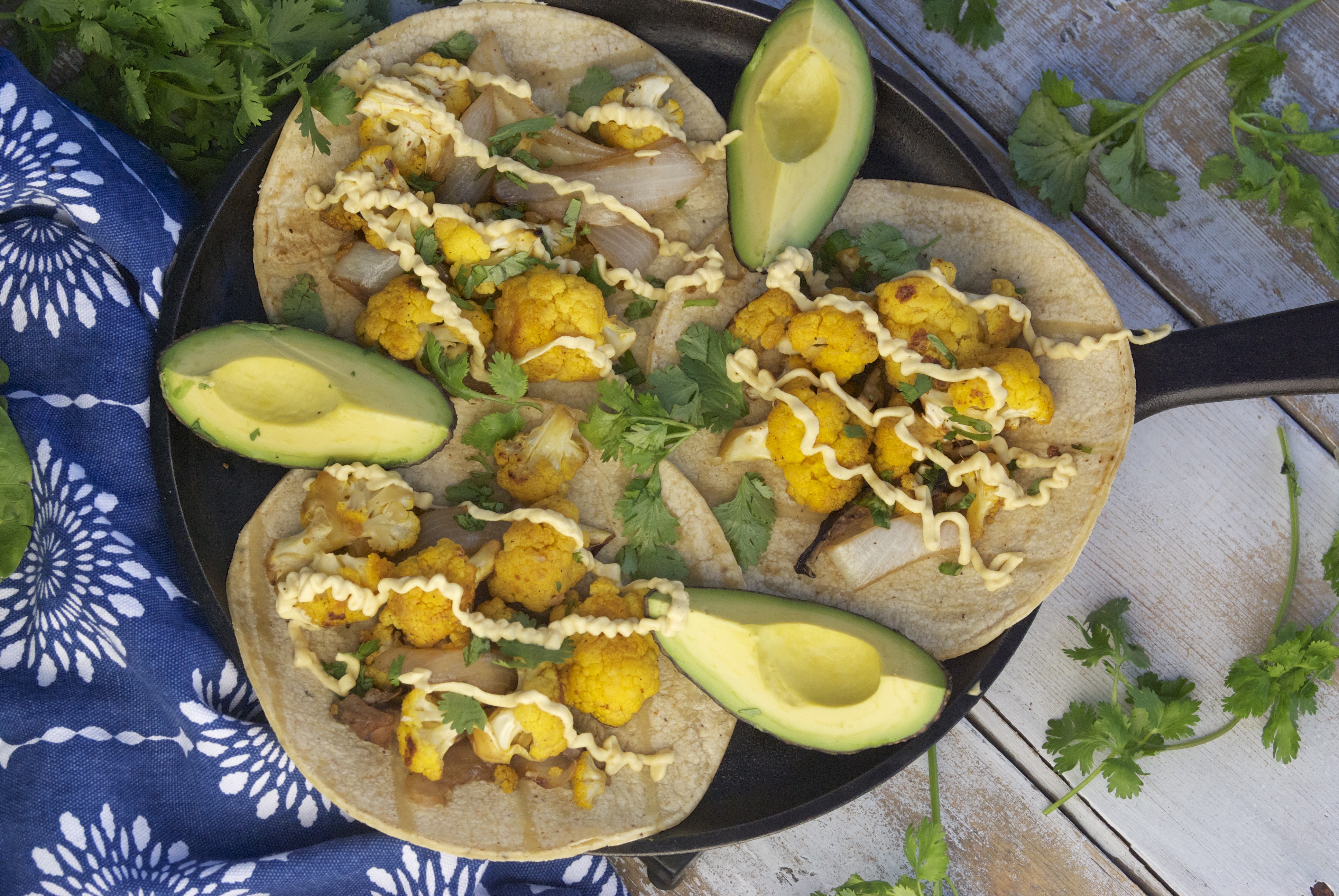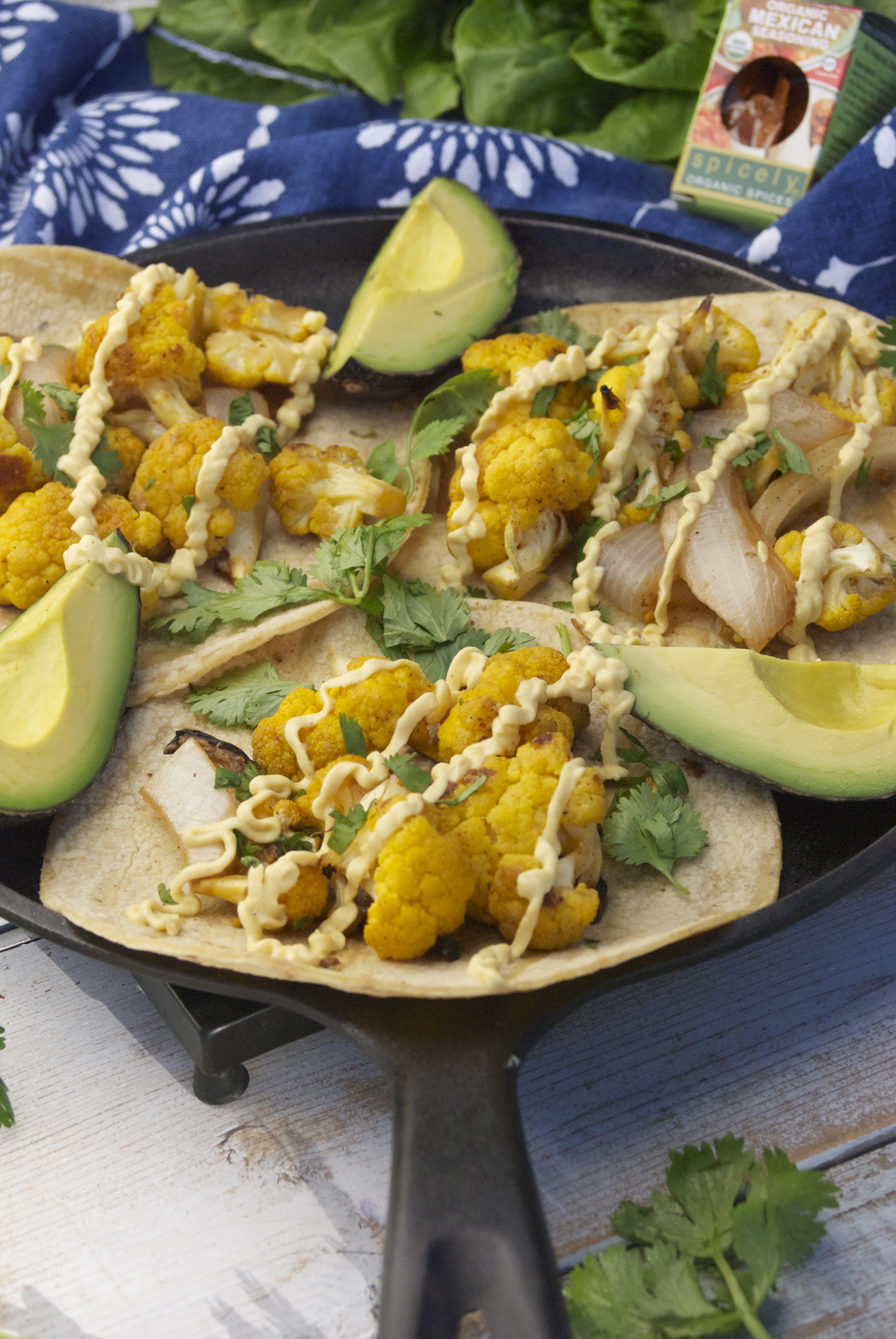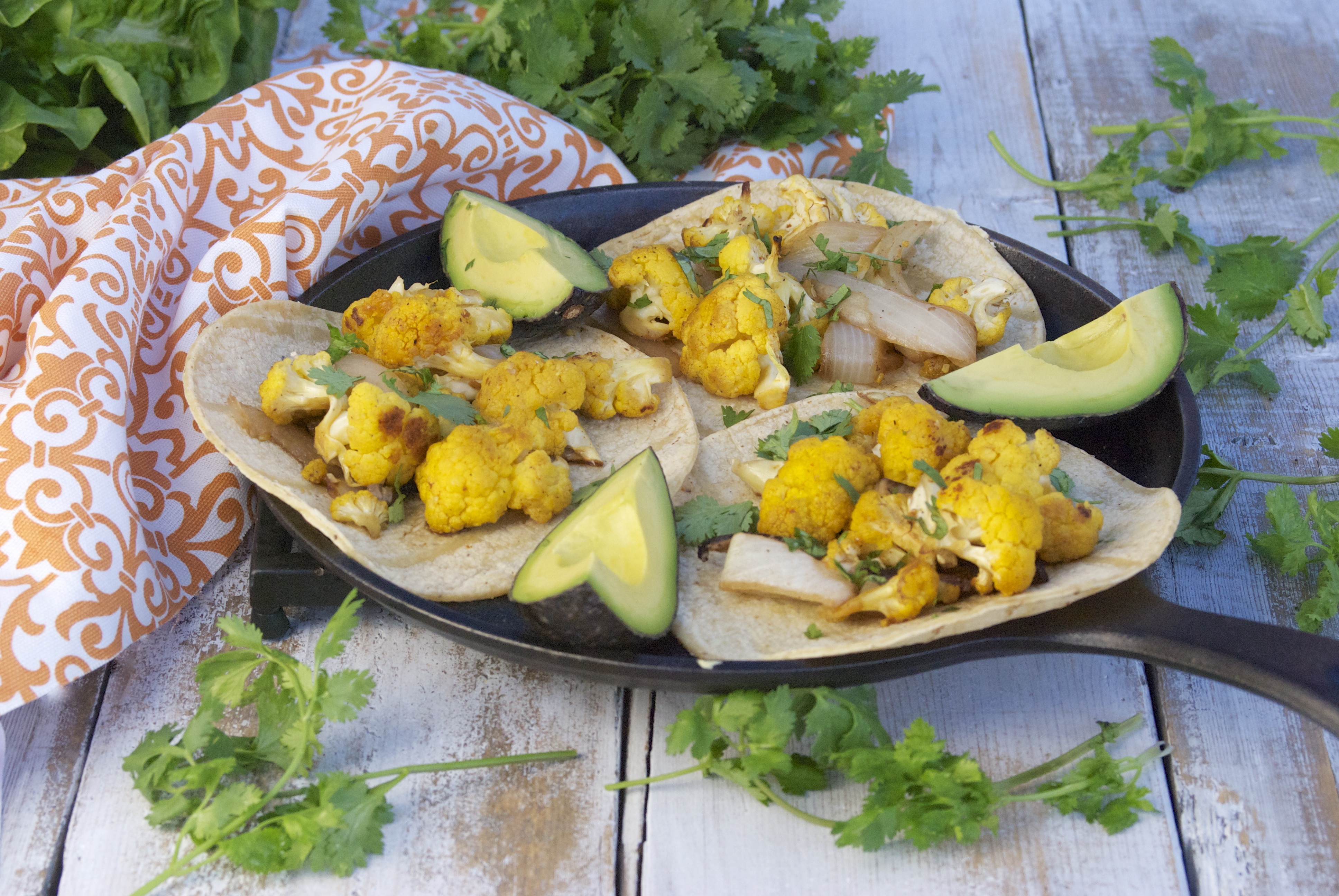 - Add cauliflower mixture to warmed tortillas. Drizzle with pumpkin sauce and garnish as desired.