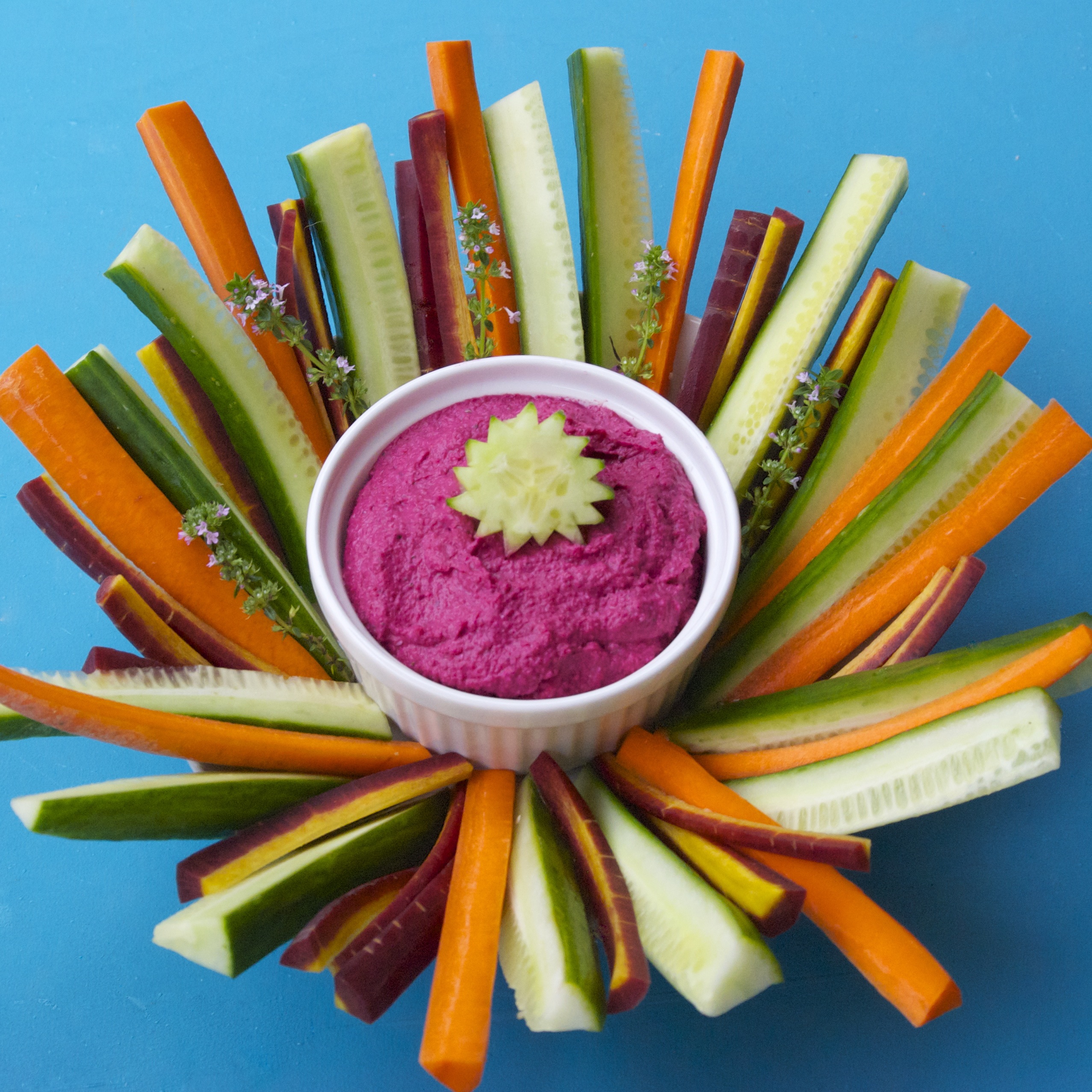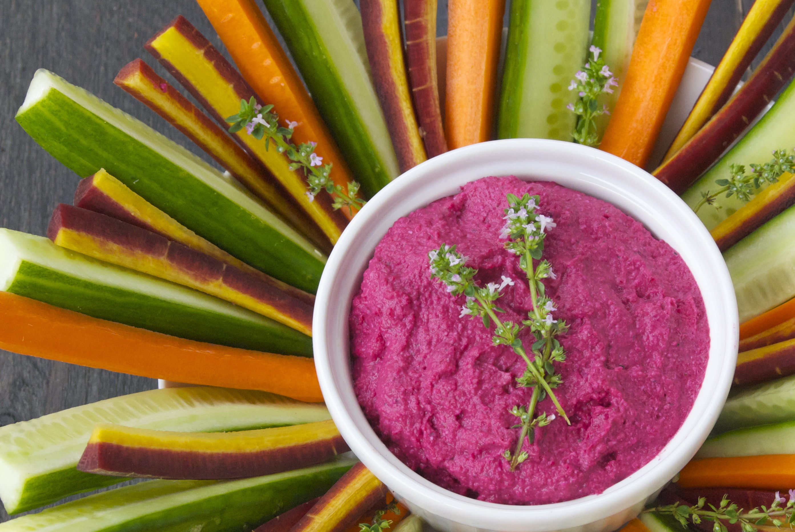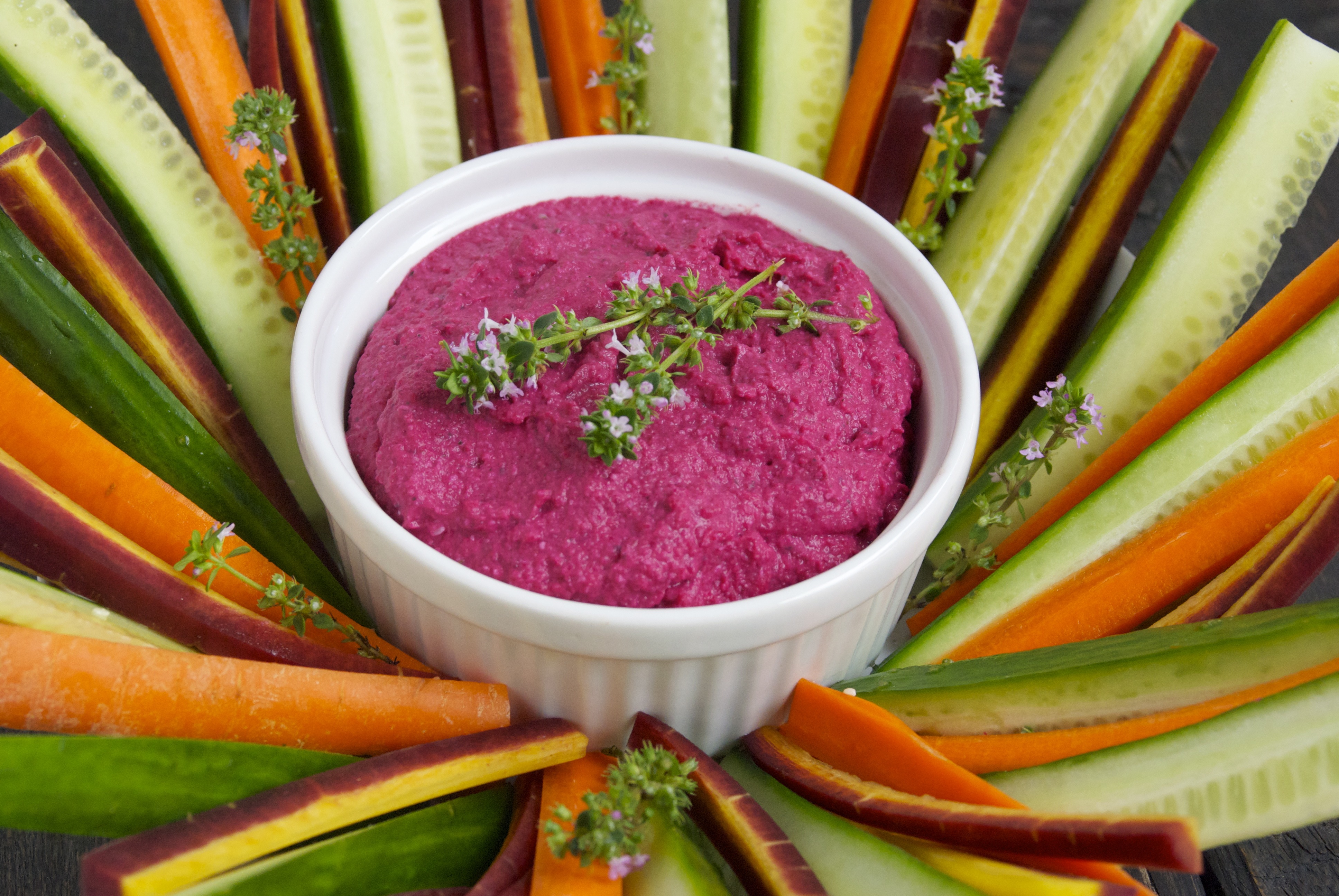 Dietary habits are very personal for most folks, often seeking new ways to eat due to illness or injury. The diets we choose to follow have become increasingly filled with strict guidelines (you know what I’m talking about…vegan, nut-free, paleo, ancestral, and gluten-intolerant) making it difficult to prepare a meal that provides nourishment and pleasure for everyone at the table. I certainly don’t profess to have all the answers to this modern-day dilemma, but I do know we can all agree on one thing, adding more plants to your diet is beneficial for reducing the risk of cancer, diabetes, heart disease and obesity. Today’s Think Pink Hummus is simply a fun way to incorporate colorful plants into your diet and provide a brightly-colored conversation starter to get your family talking about cancer prevention.