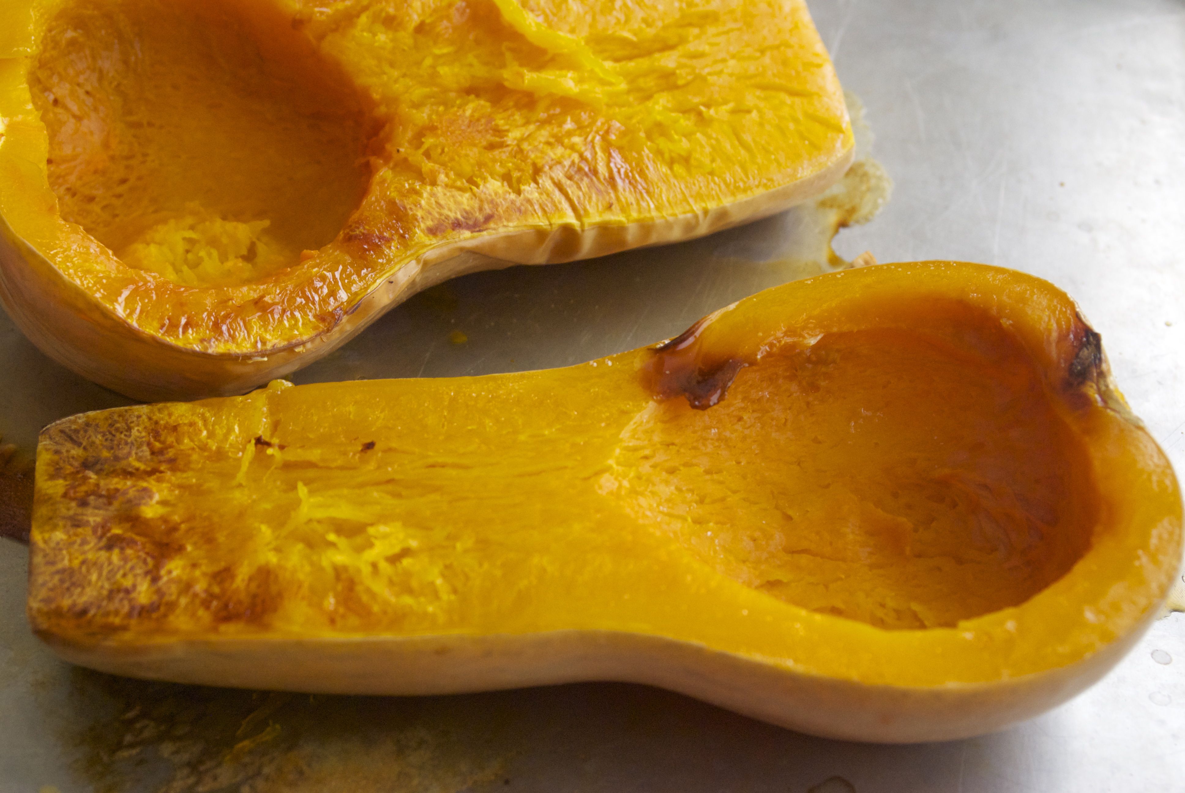 - Place butternut squash halves on a large baking sheet flesh side up.