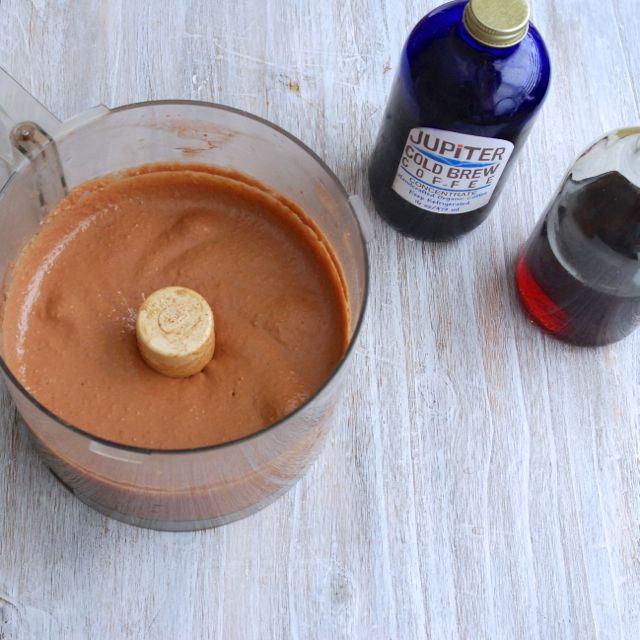 - Using a food processor or high-speed blender, add all filling ingredients: coconut meat, soaked cashews, coconut oil, cold brew coffee, raw cacao powder, maple syrup, sea salt, cardamom and vanilla.