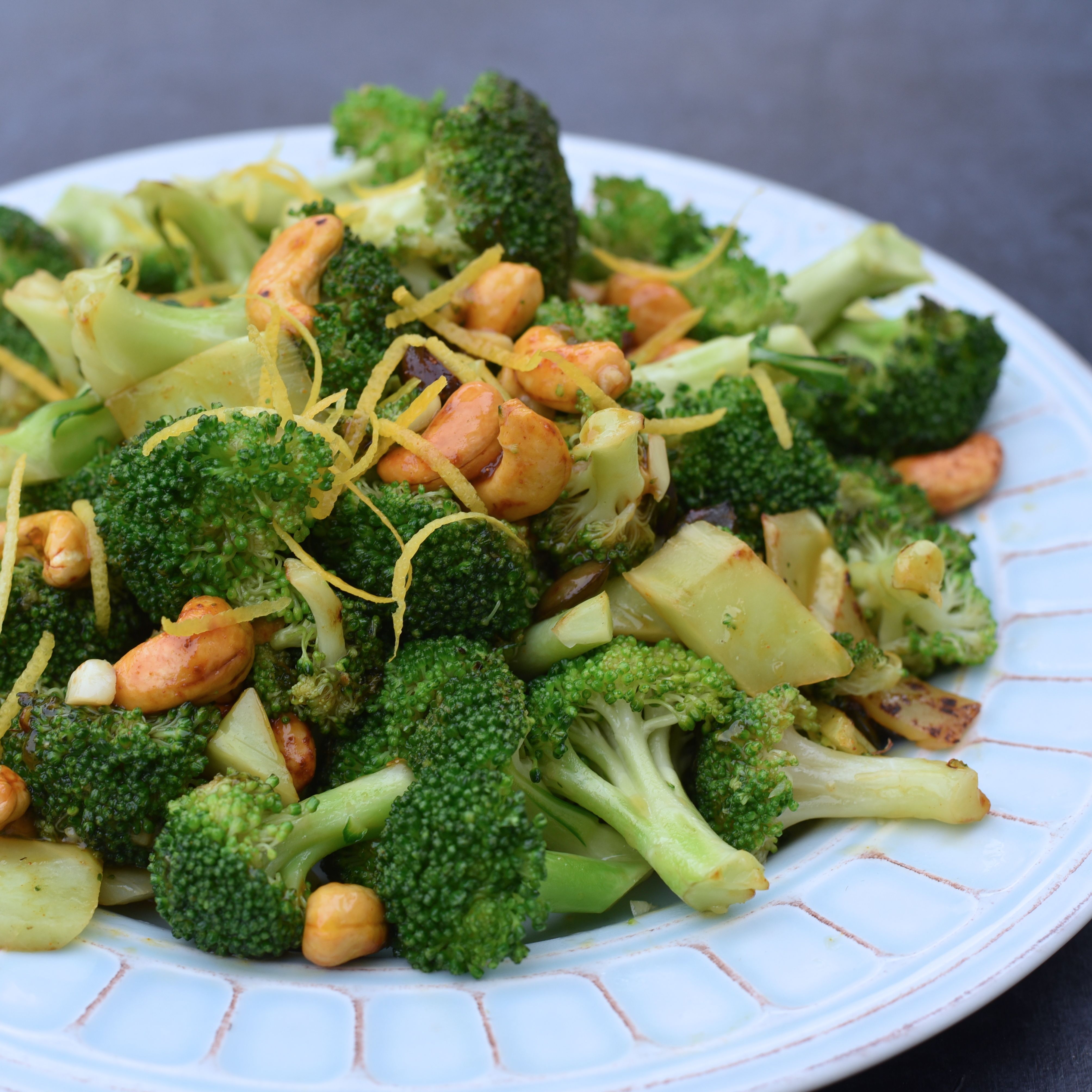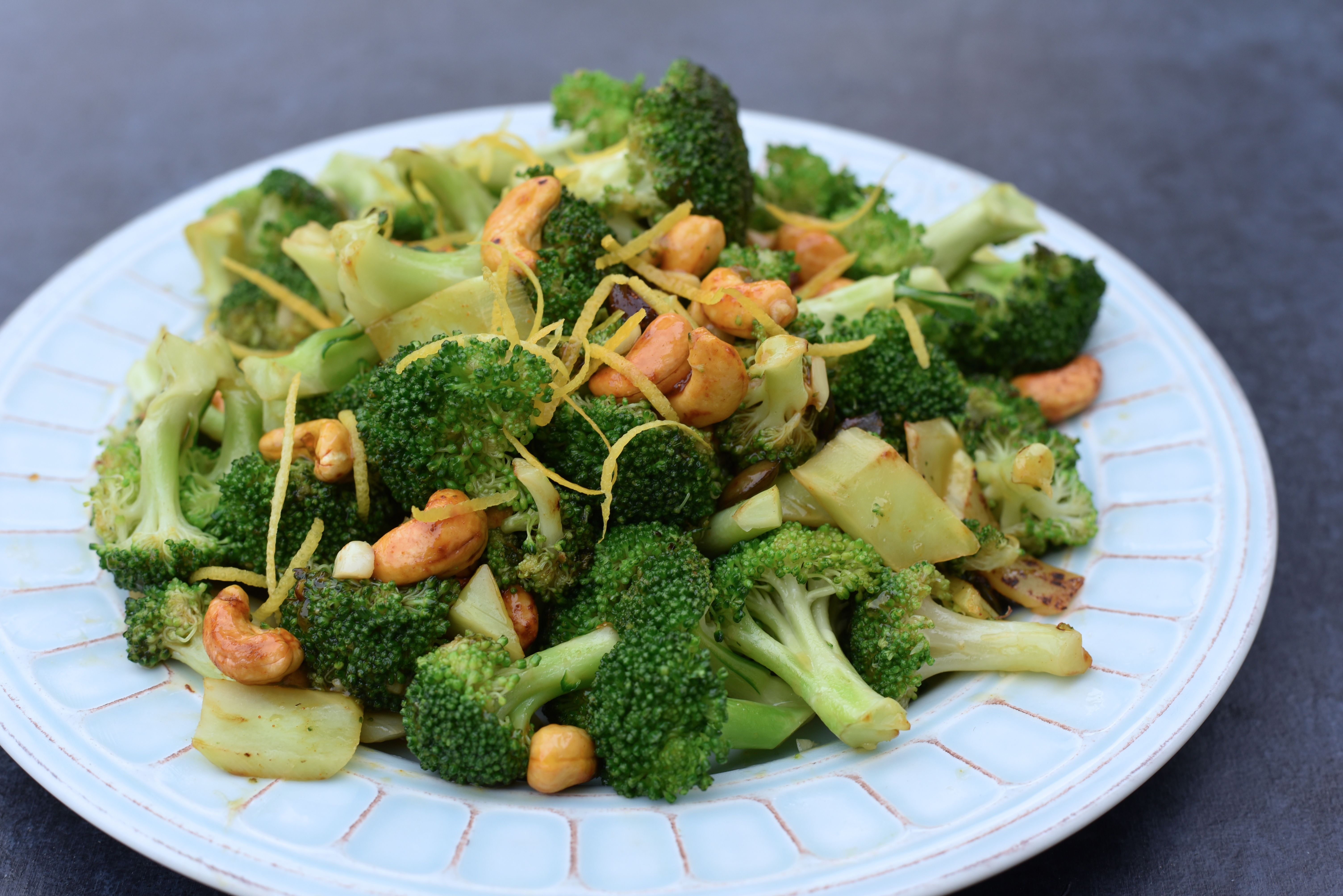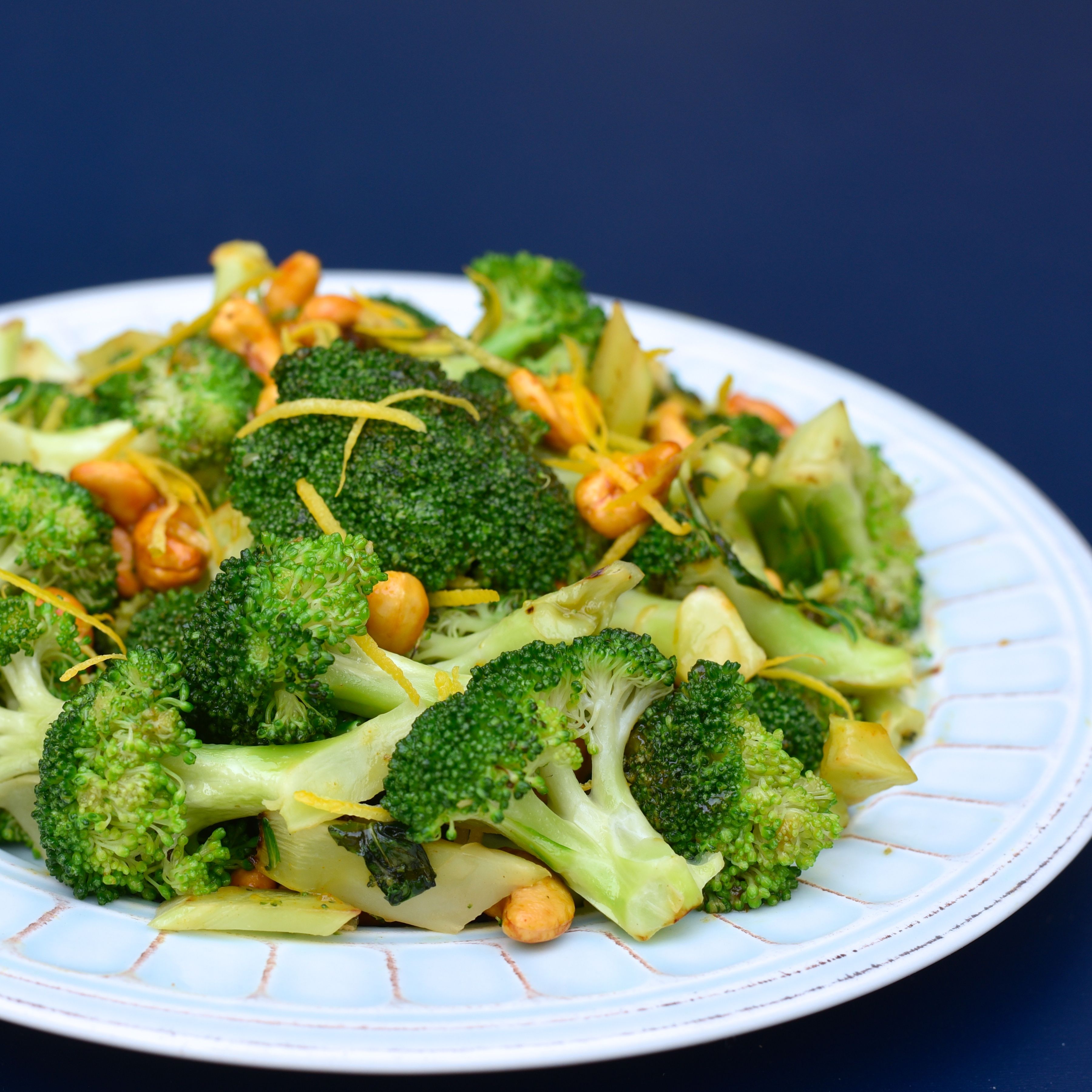Broccoli is by far my favorite cruciferous veggie and one I typically include in any weekly meal plan. These beautiful tree-like florets and sweet tasting stems remain a constant addition to just about any meal at the Kelly house. Not only is broccoli delicious but also provides an abundance of nutrients, including anti-cancer and anti-viral properties. Today’s recipe is all about broccoli with a citrus twist. Our Asian Lemon Broccoli Stir Fry combines the natural sweetness of broccoli, saltiness of tamari and fresh seasonal citrus for a side dish that is sure to please. We’ve topped it all off with our warm Tarmari Turmeric Cashews and Pepitas.