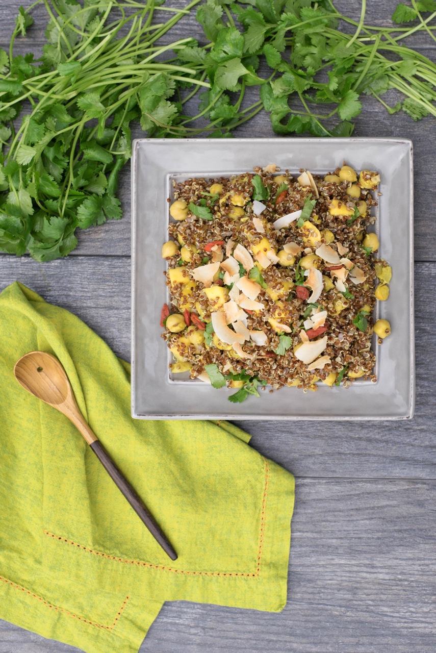 It’s been a month since my last run in with quinoa in the GFF kitchen and I’m happy to report we’re back in business again. Our Indian Spiced Coconut Mango Quinoa combines the lovely spices of India with Alter Eco’s Organic Red Heirloom Quinoa, a special combination with the addition of creamy coconut milk, sweet organic mango and antioxidant rich goji berries. Packed for lunch or snack time, this power salad will help get you through the day.