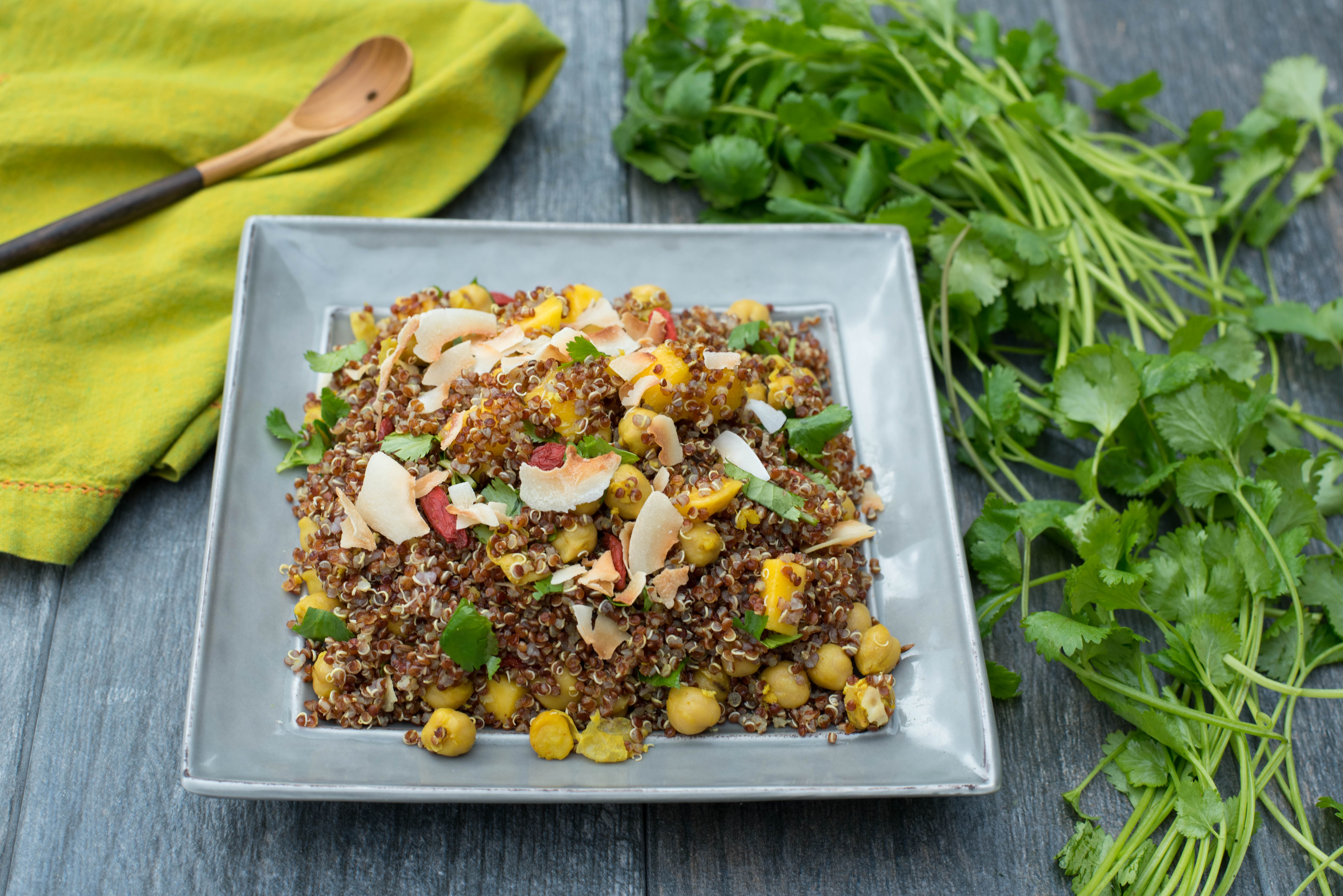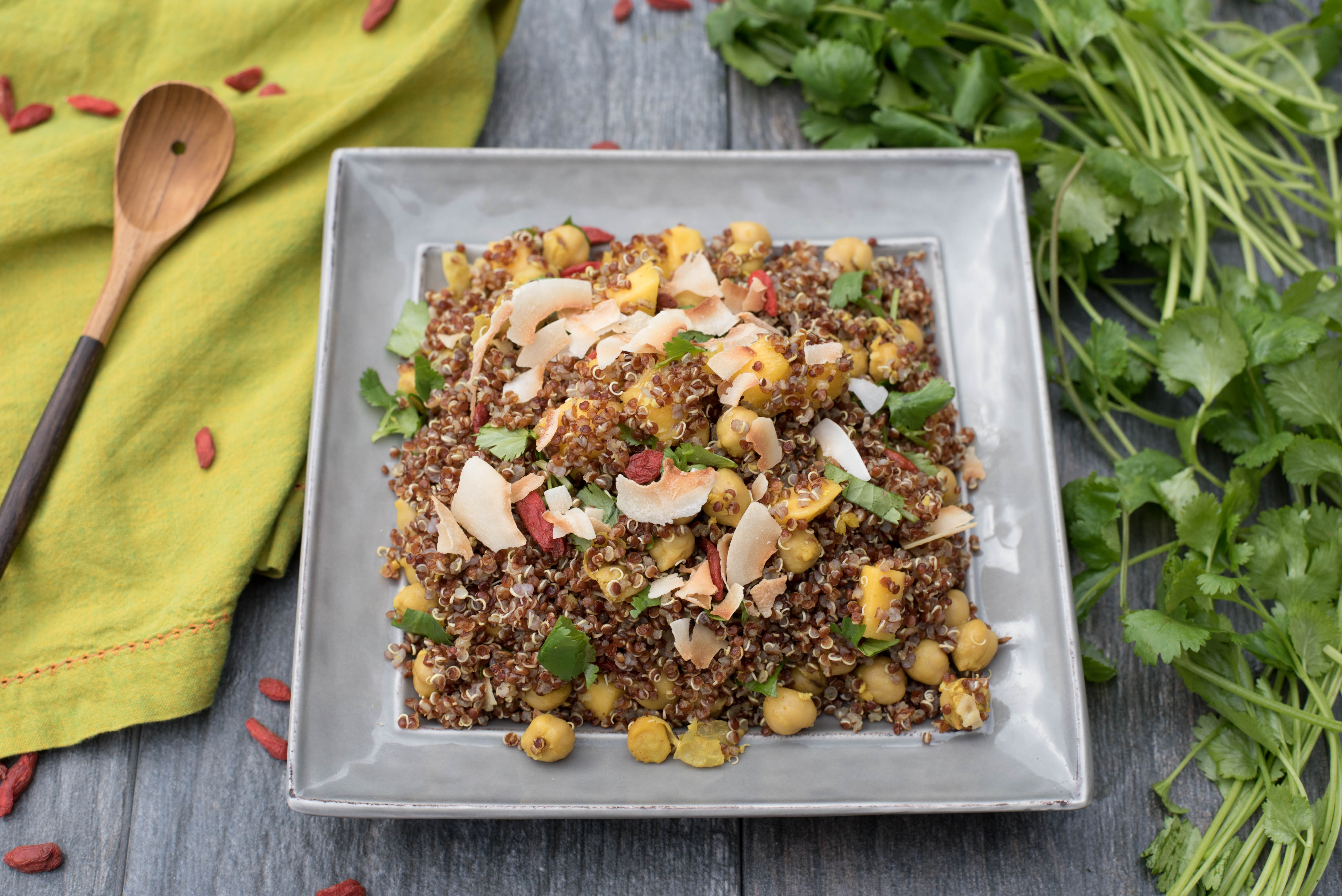 - Combine cooked quinoa, spiced garbanzo beans (after they have cooled), mango, goji berries chopped cilantro and dressing. Lightly toss to combine.