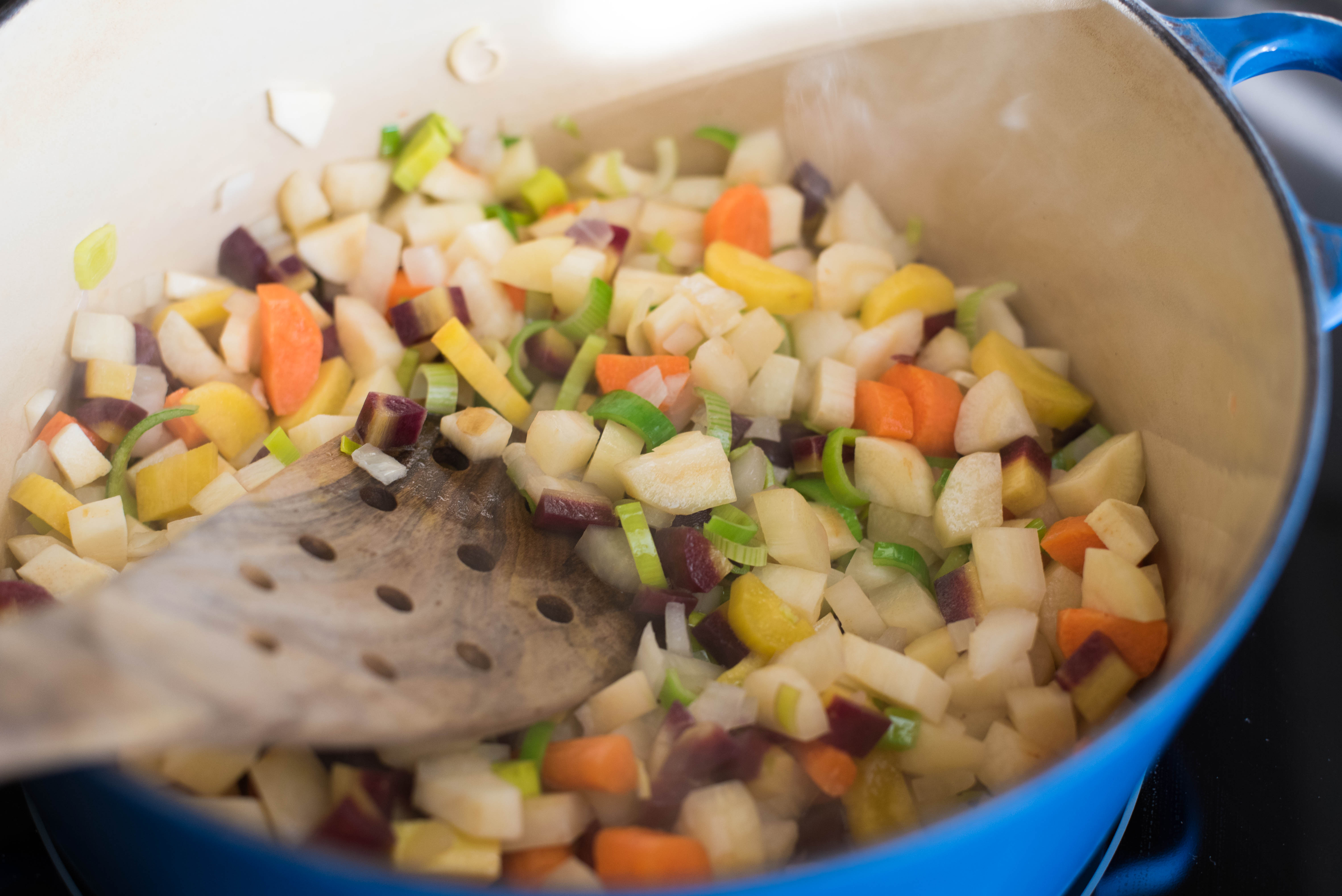 - Using a heavy-bottom soup pot, over medium-high heat, add coconut oil, and chopped roots.