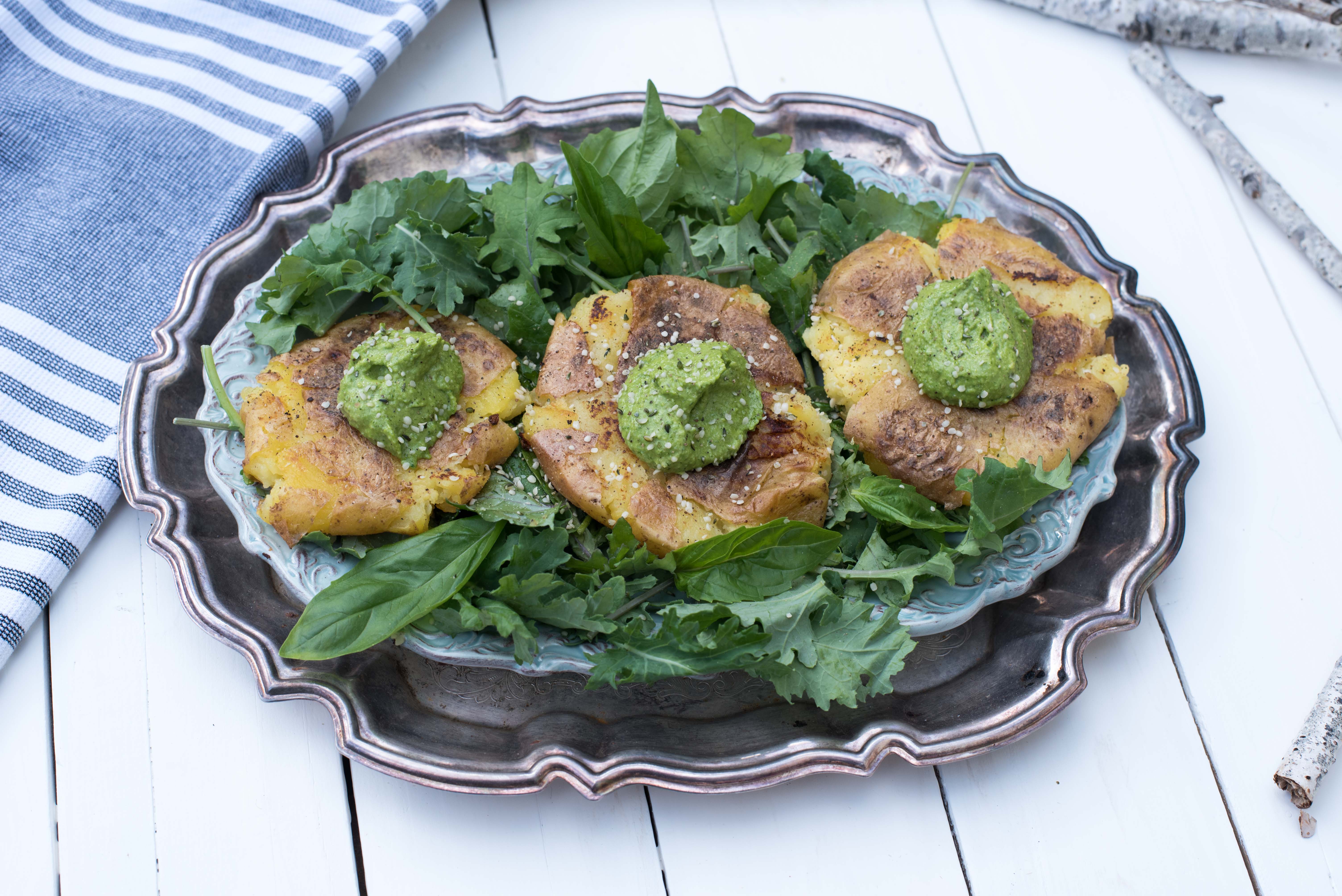 - Serve warmed potatoes on a bed of fresh, organic arugula and a dollop of pesto.