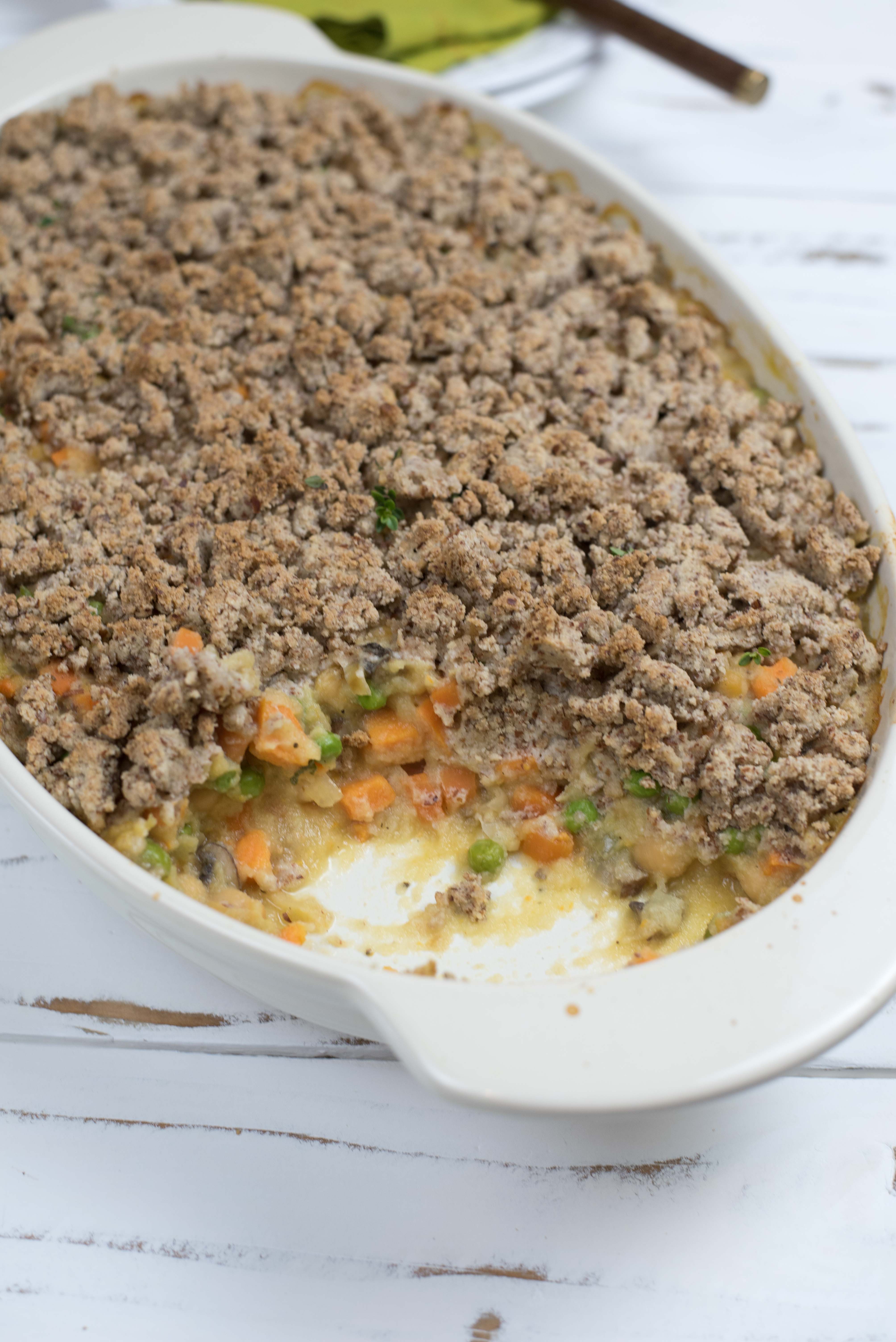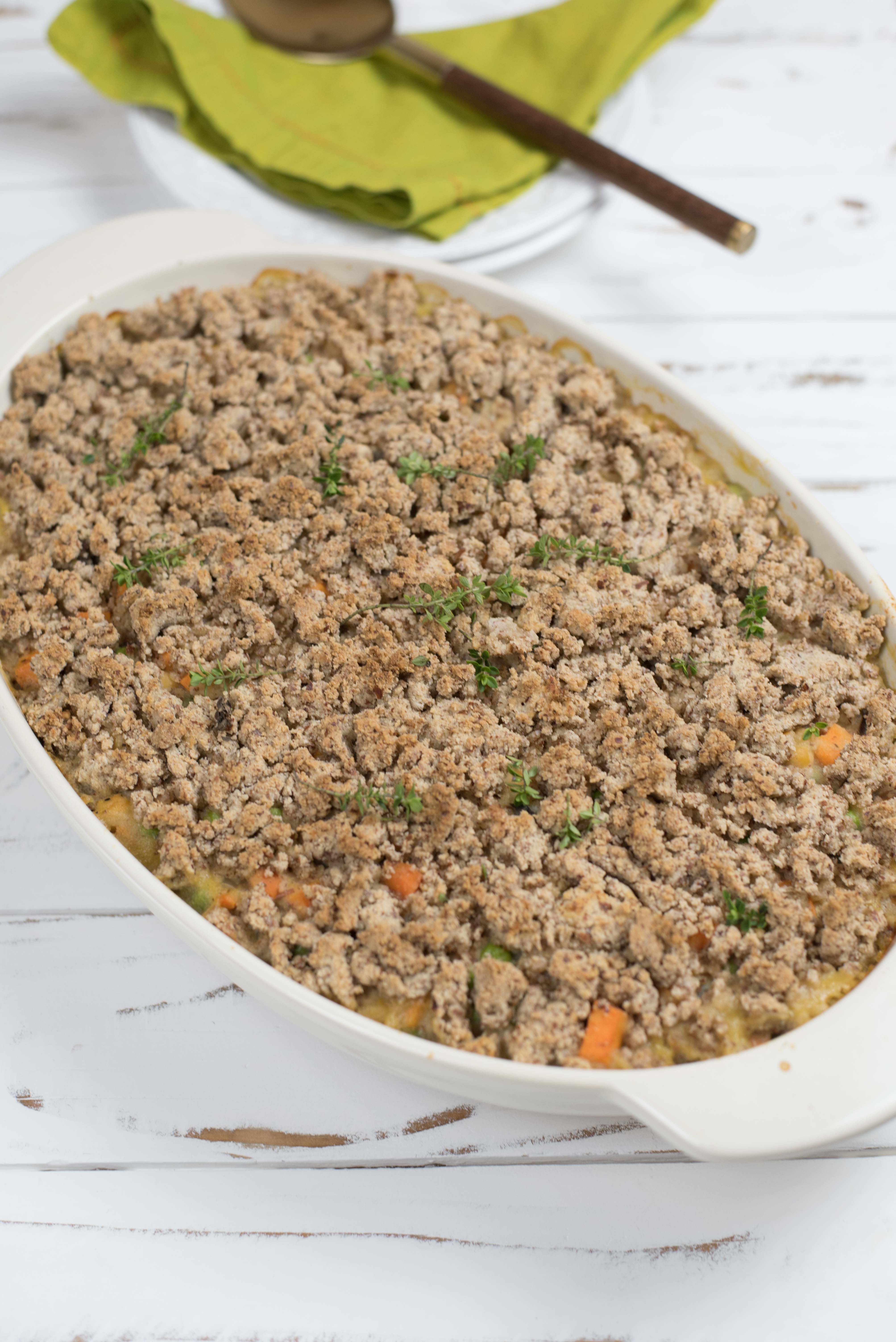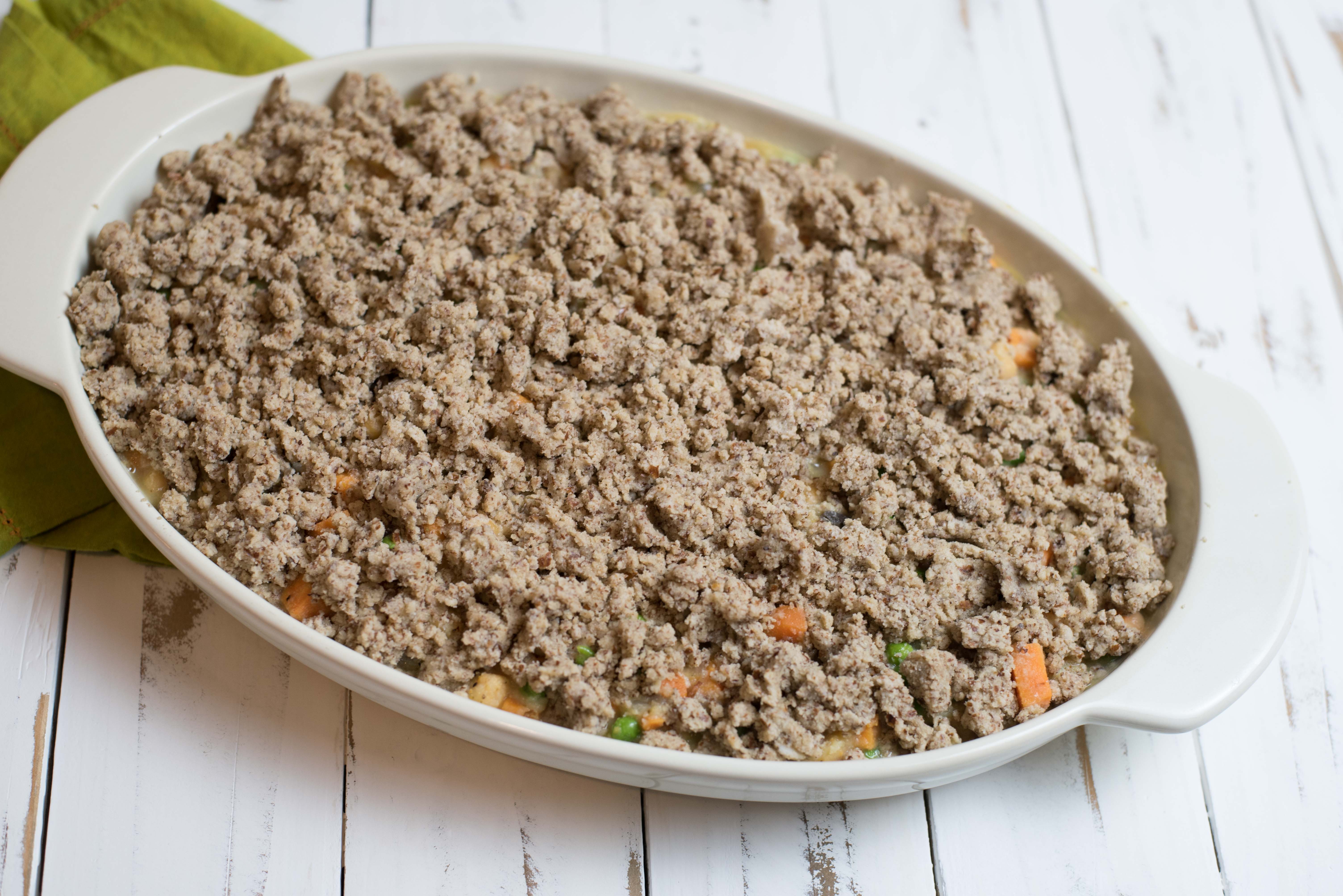 - Crumble dough over vegetables in casserole dish.