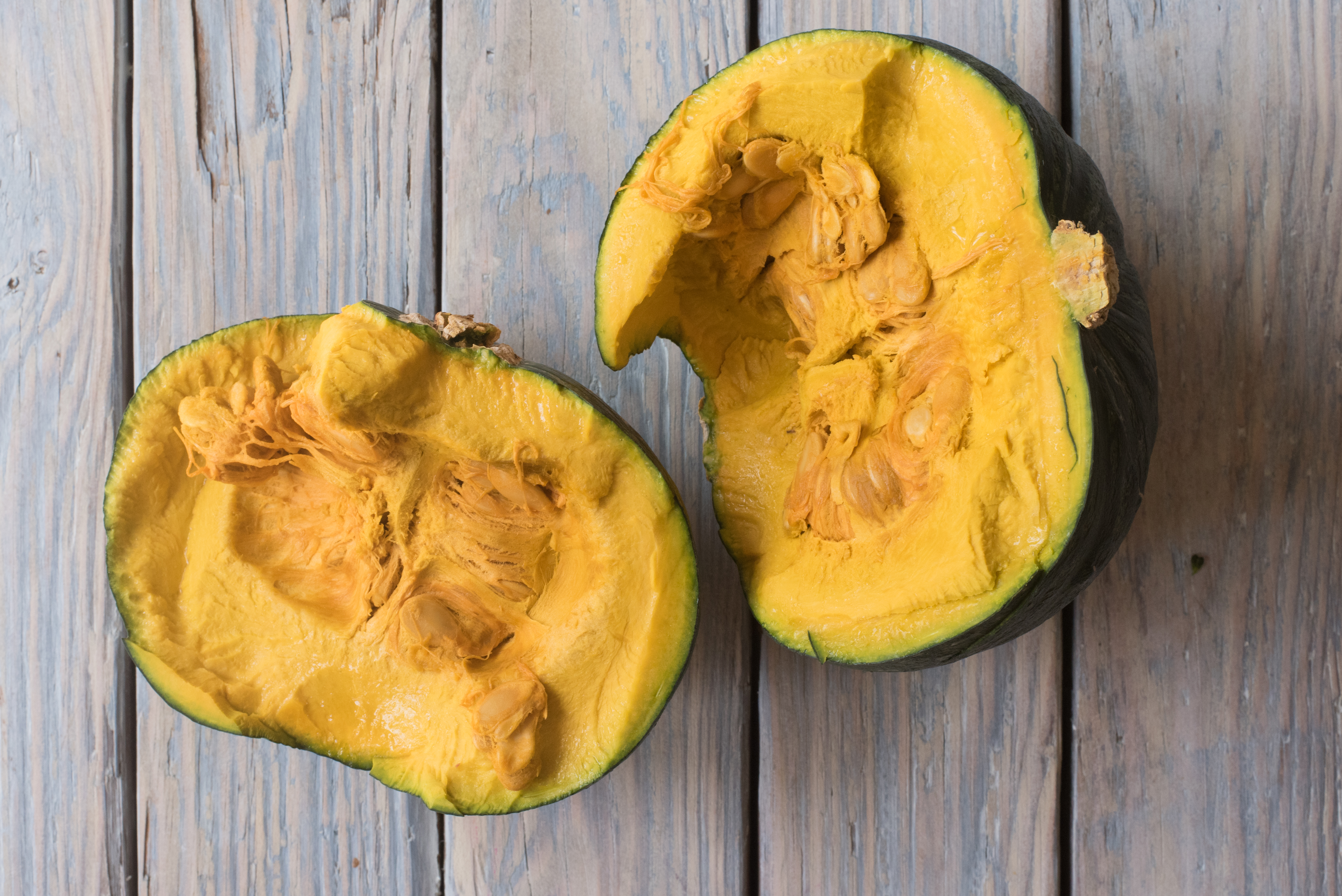 - Wash organic kabocha. Cut in half and scoop out seeds.