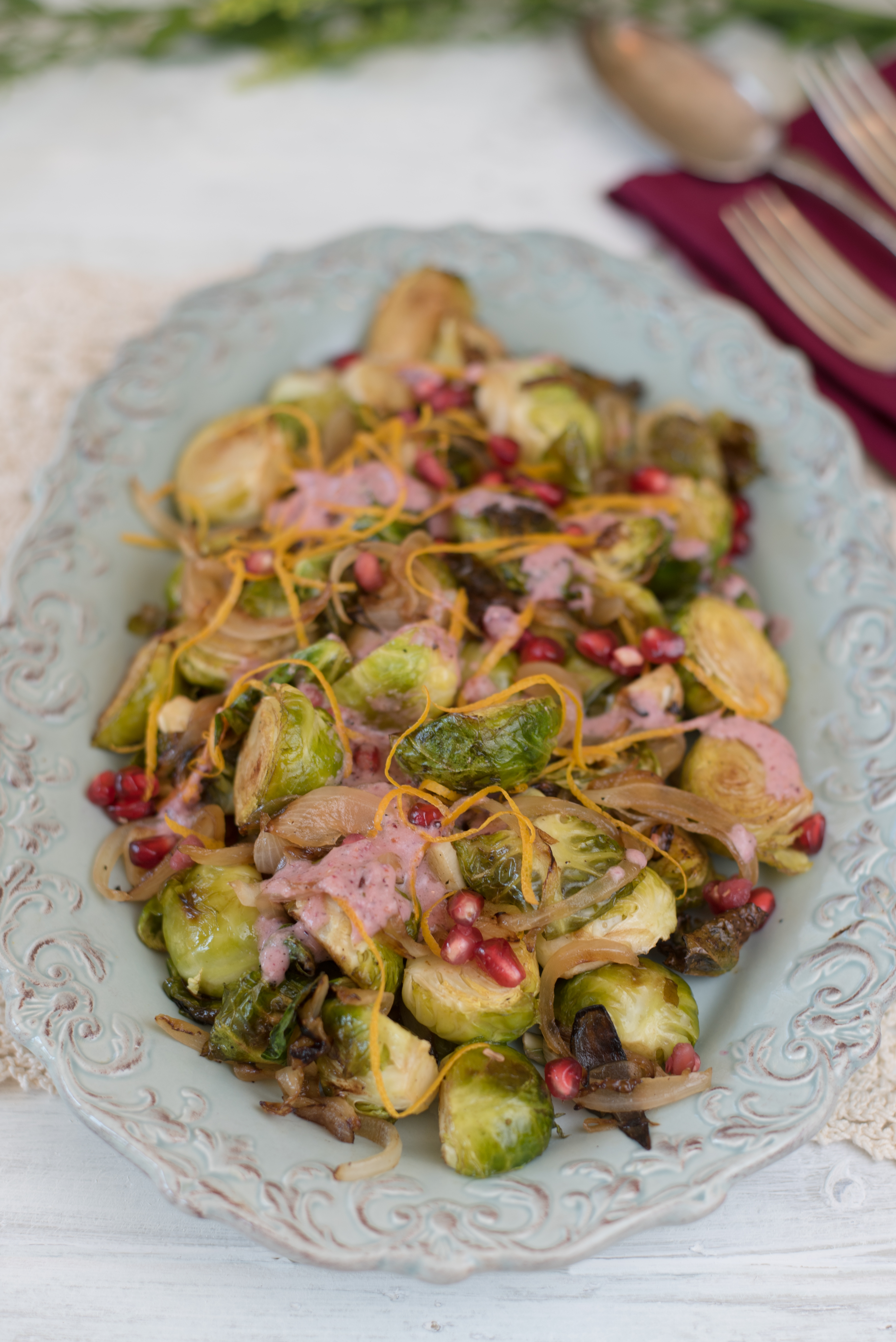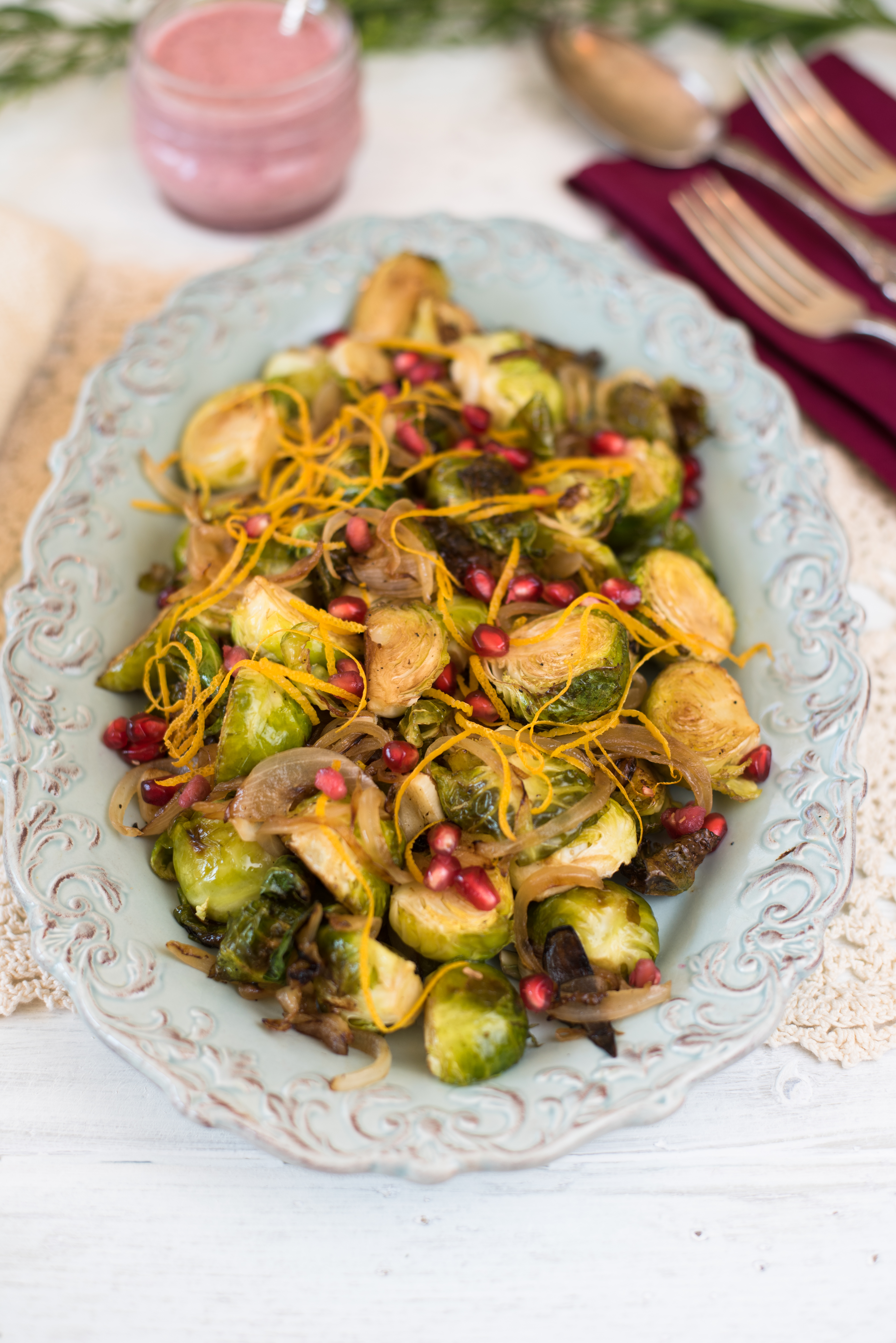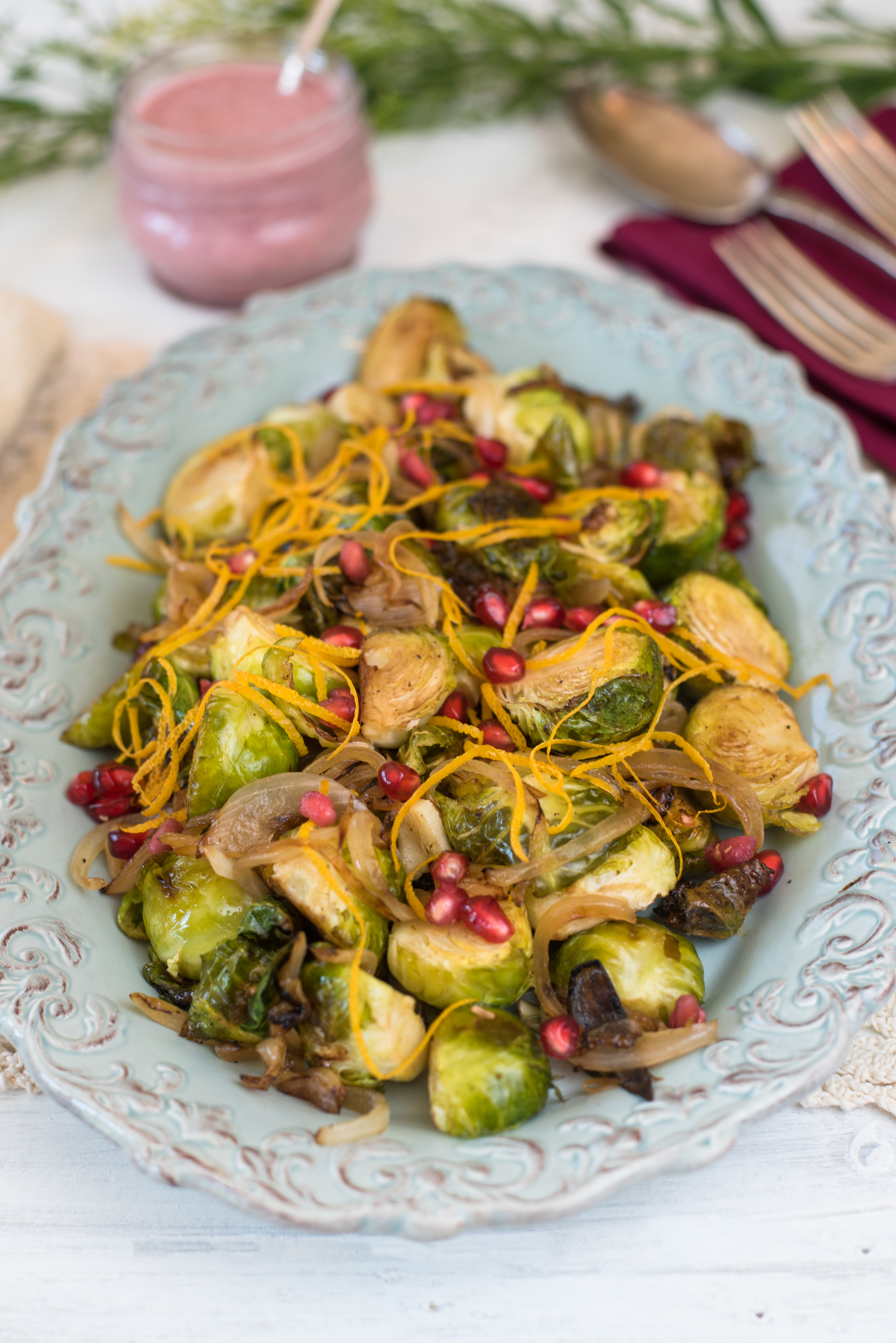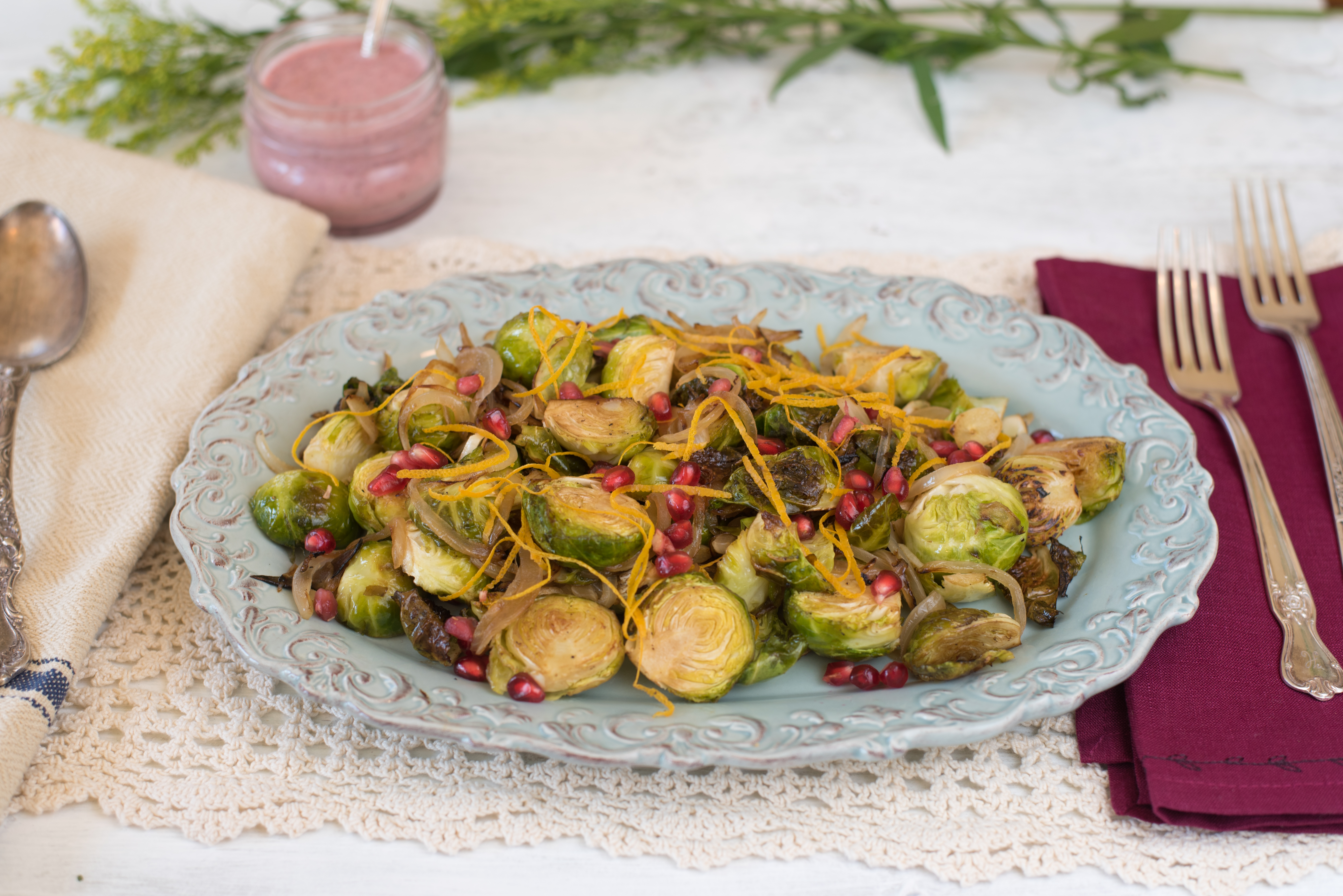 It’s the Friday before Thanksgiving week my friends and I’m heading out with reusable bags, a lovely thermos of warm tea and a heart full of inspiration. Here I come Trader Joe’s, Whole Foods, Jimbo’s and Lazy Acres; in search of your season’s best offerings. Before I get lost in my to-do list, I wanted to share a quick recipe for your Thanksgiving meal. My Holiday Brussels Sprouts are a crowd favorite in my house with their caramelized onion and garlic, crispy outer leaves and drizzle of homemade Orange Cranberry Vinaigrette.