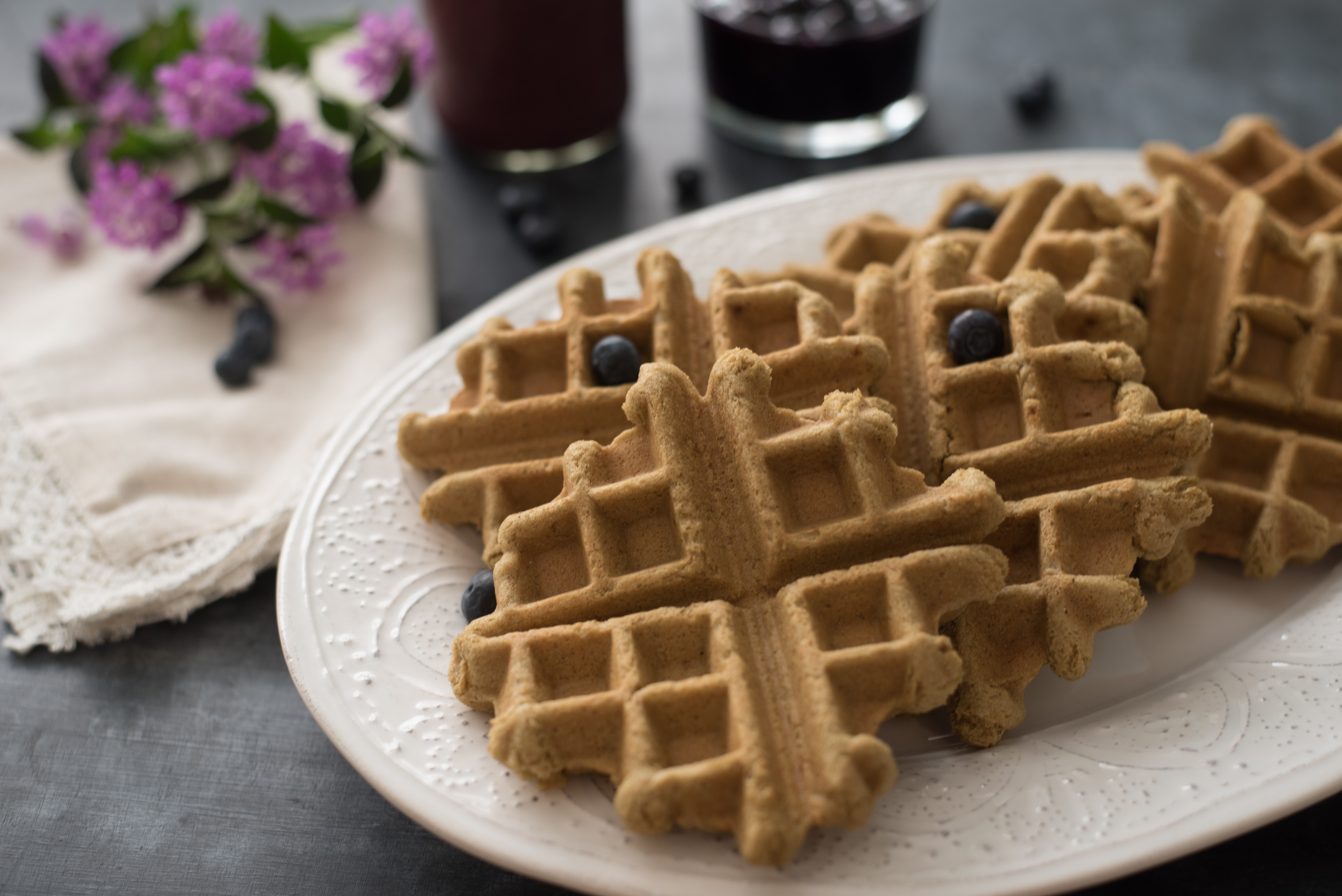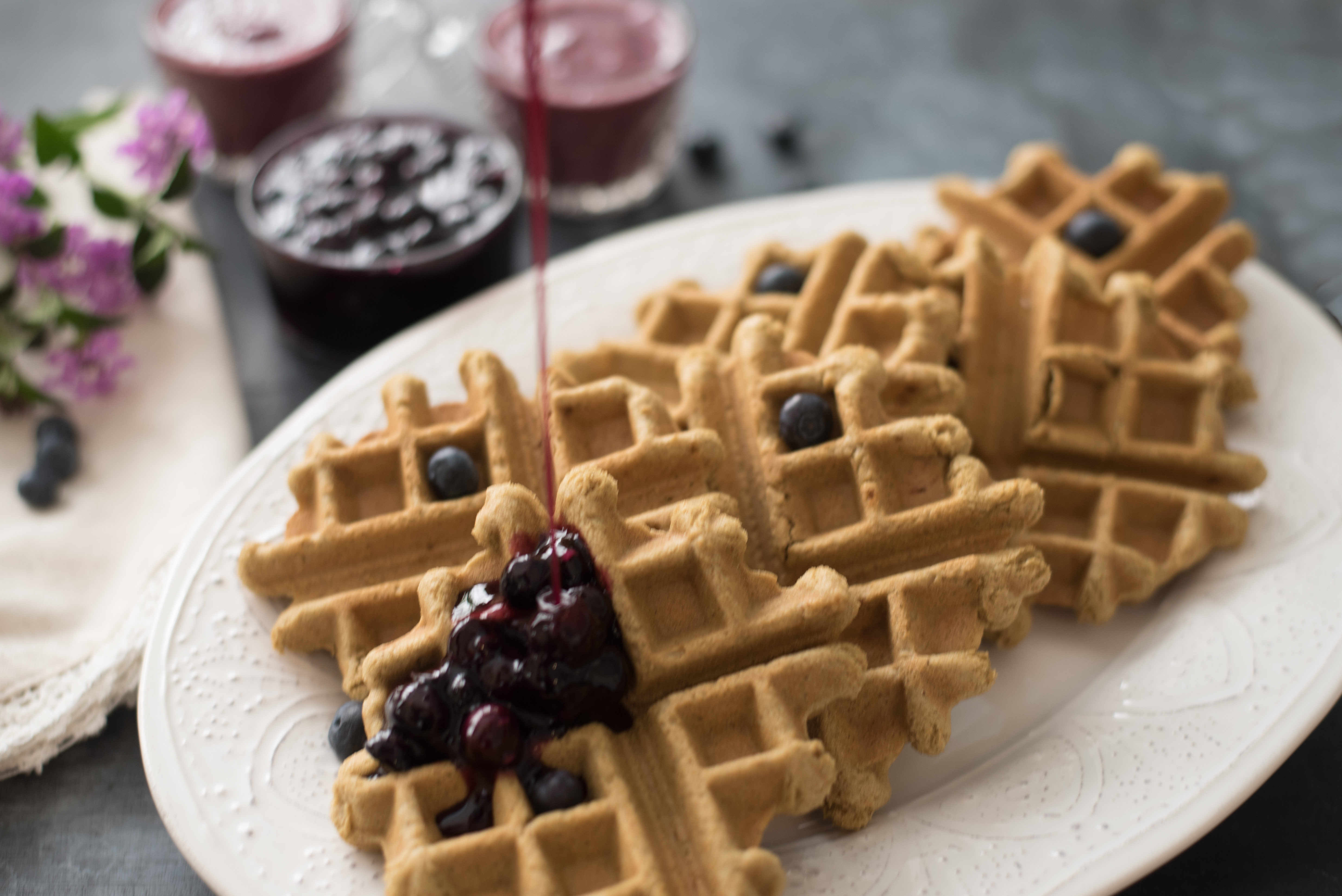 Today I’m sharing my Gluten Free Vegan Teff Waffles drizzled with a warm blueberry syrup. I love the light, yet hearty flavor of these waffles and find them perfectly suited for a special weekday breakfast or weekend brunch. As always, when making a batch of waffles, try doubling the recipe and freezing any leftovers. These waffles heat up nicely in a toaster and become the perfect on-the-go breakfast for a busy morning.
