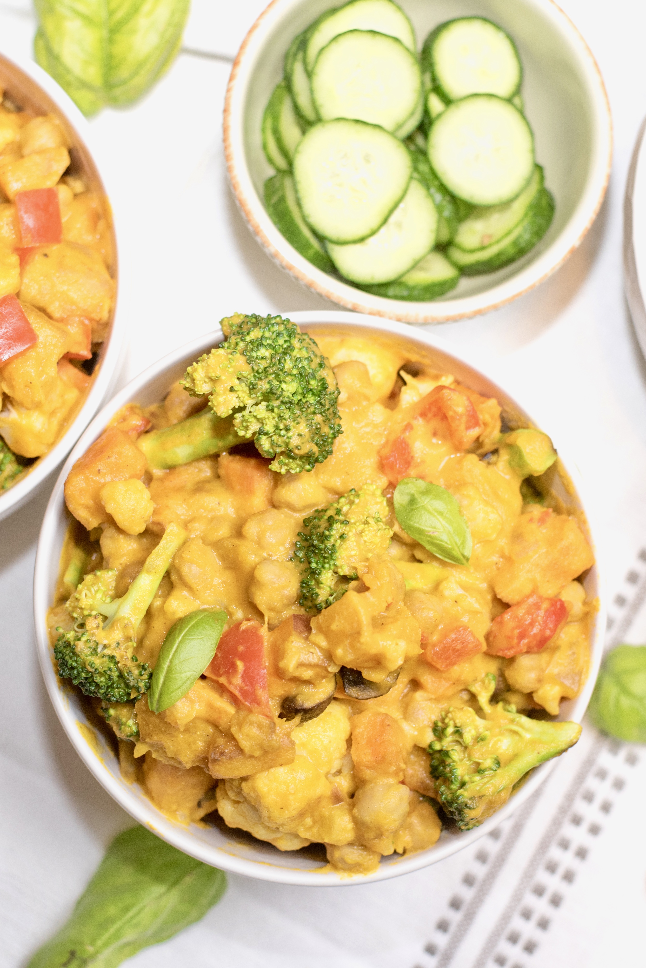 - Optional: I like adding chickpeas to this dish and typically add them into the saucepan with the curry sauce before bringing to a bubble (simmer).
