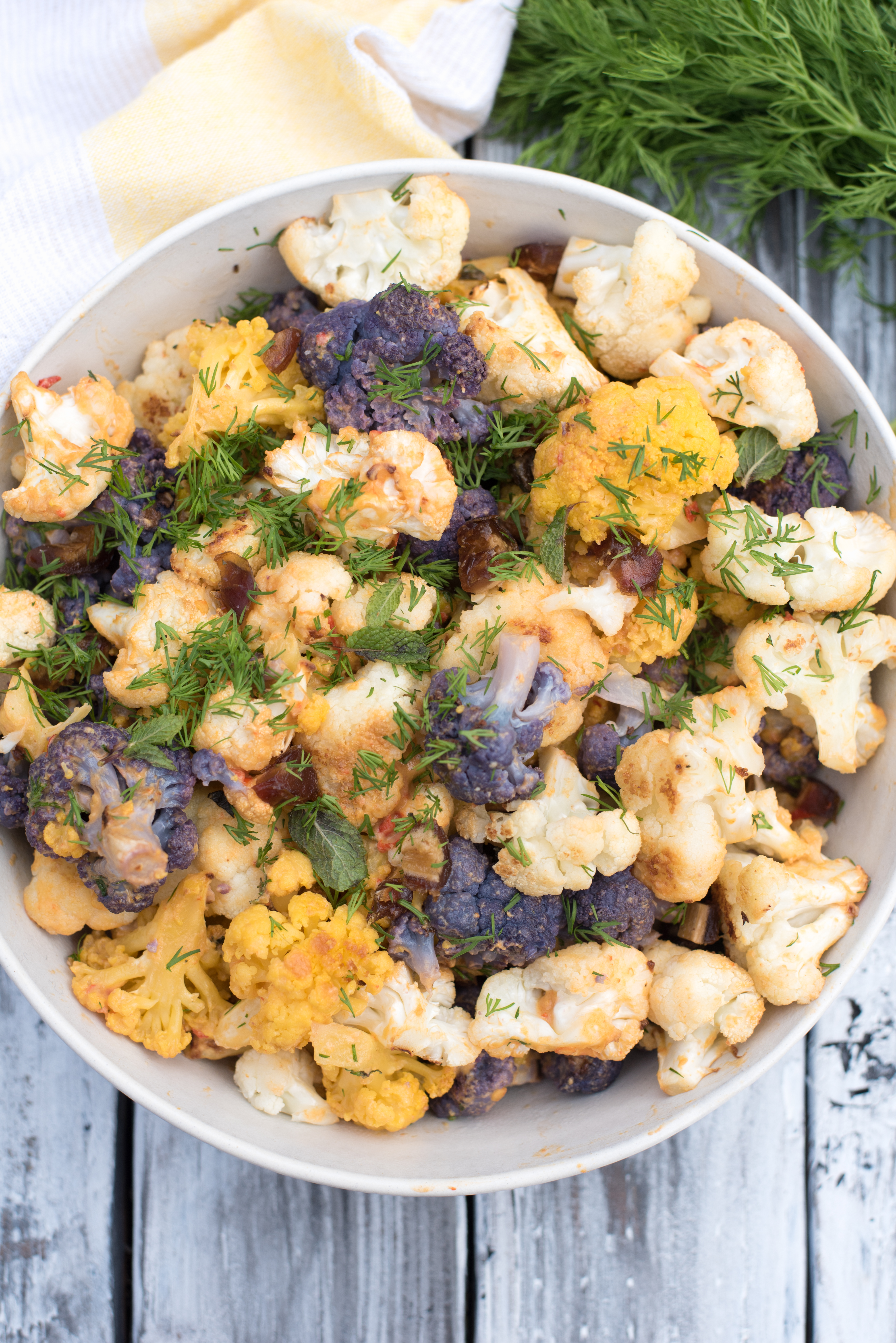 Our Tahini Harissa Roasted Cauliflower combines colorful cauliflower, raw pistachios, Medjool dates, fresh mint and fresh dill; all drizzled with a slightly spicy Tahini Harissa sauce.