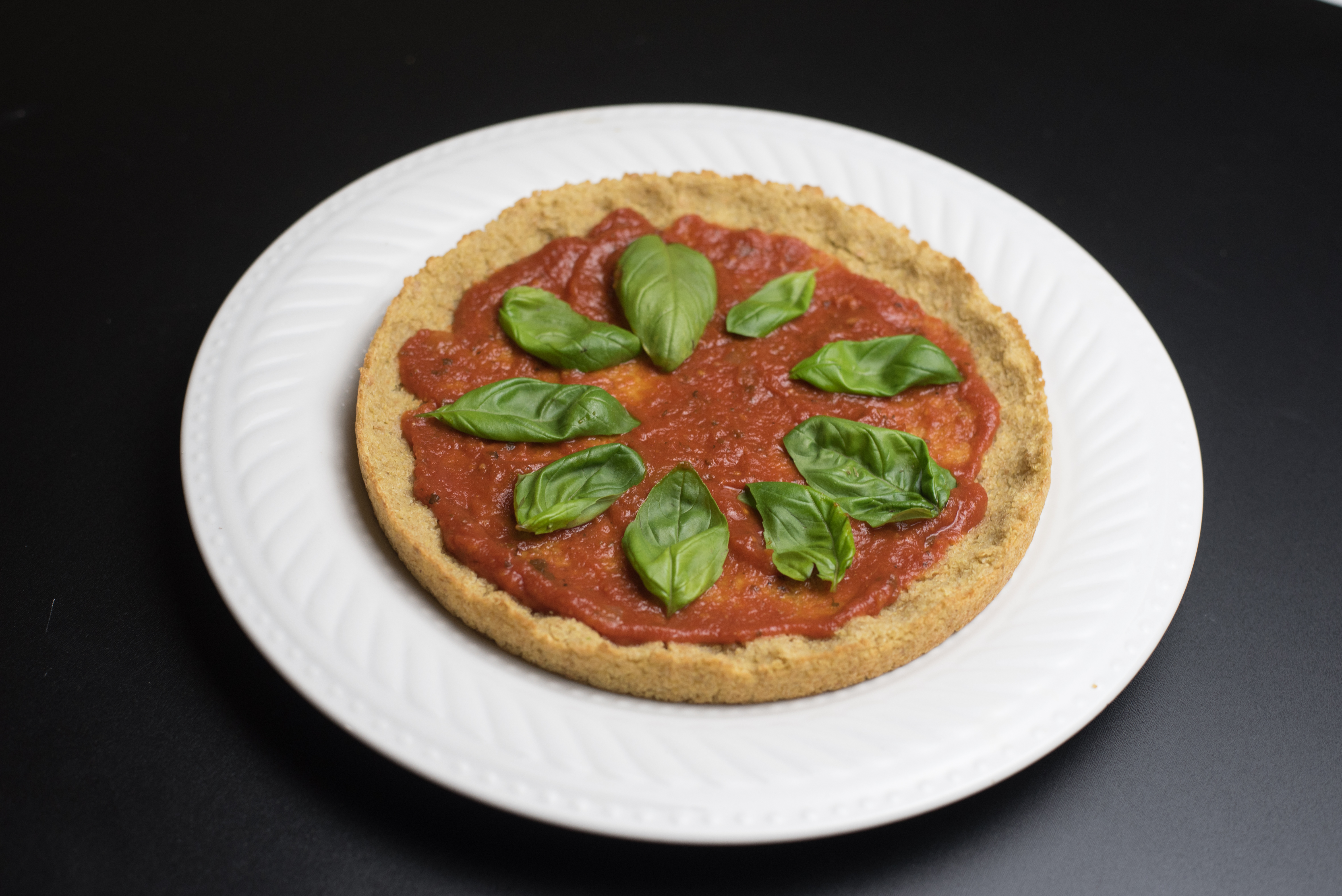 - Spread your favorite sauce or pesto onto the top of your crust, leaving an edge.